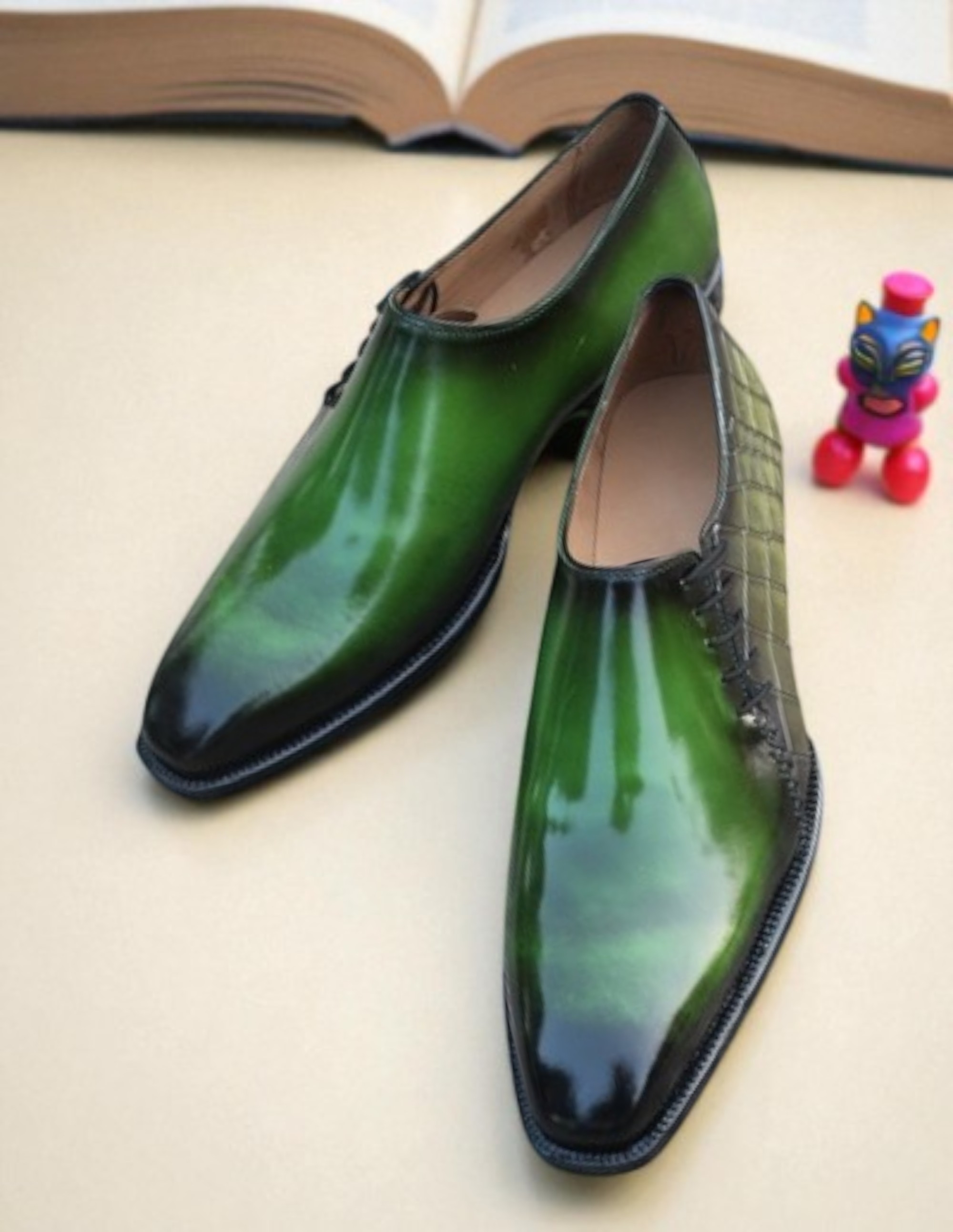 Crafted Leather Stunning and Classic Green Patina Crocodile Leather Alligator Side Laces Dress Shoes