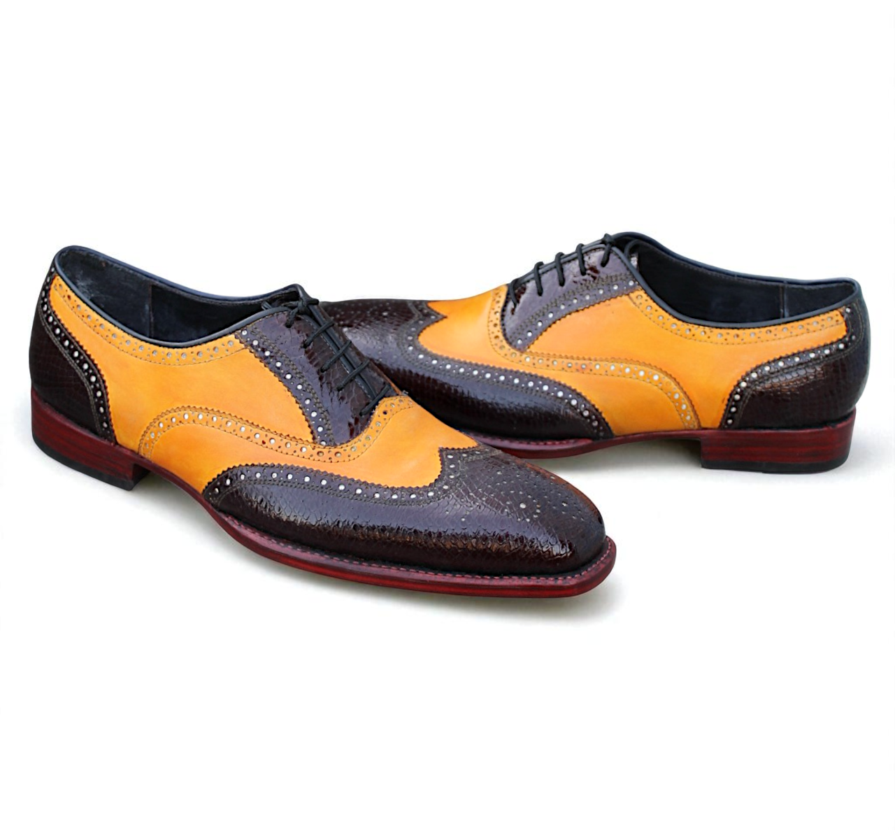 Inner: Soft Leather Sole: Leather Gender : Male Heel: Leather Color: Brown Camel Style: Wingtip Dress Shoes Totally Hand stitched Manufacturing time 7-10 business days If you can’t find your Size/Colorjust send us message we will make for you.