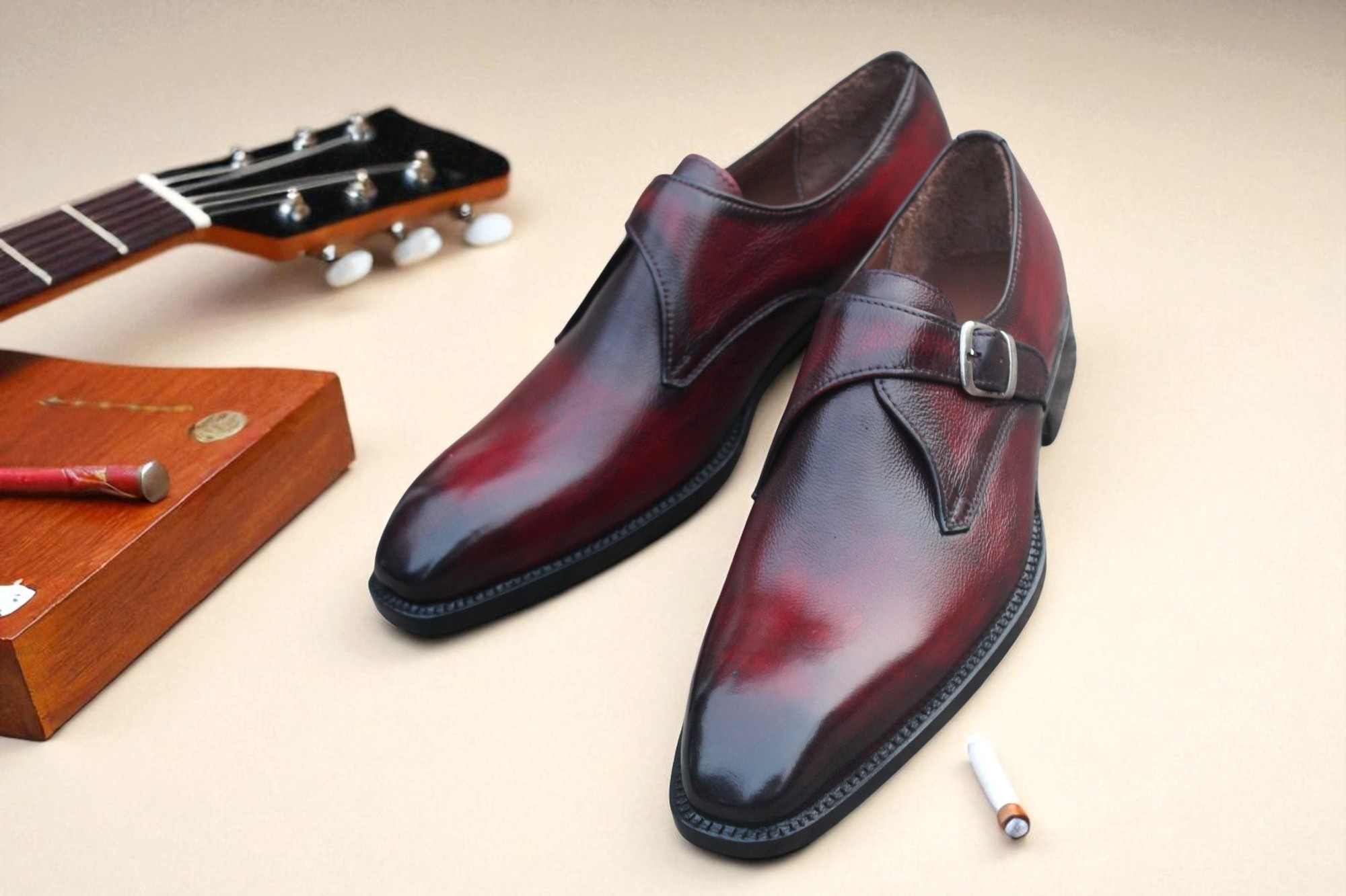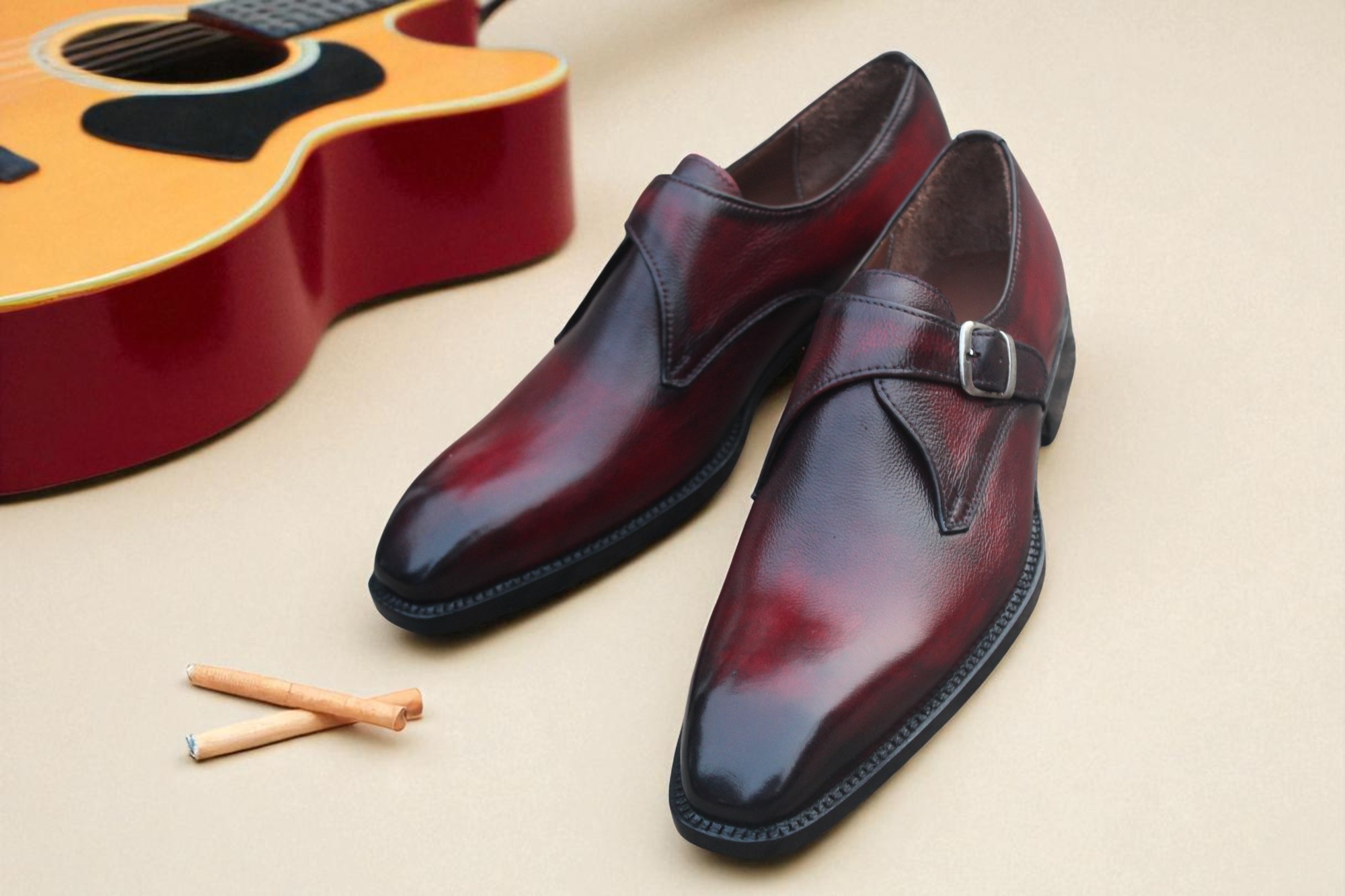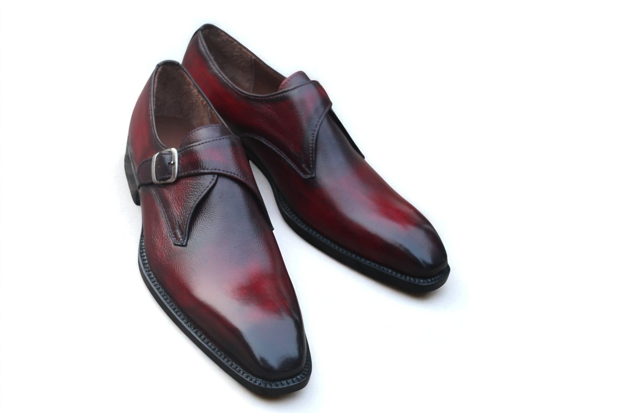 Crafted Leather Dark Burgundy Patina Leather Monk Strap Dress Shoes