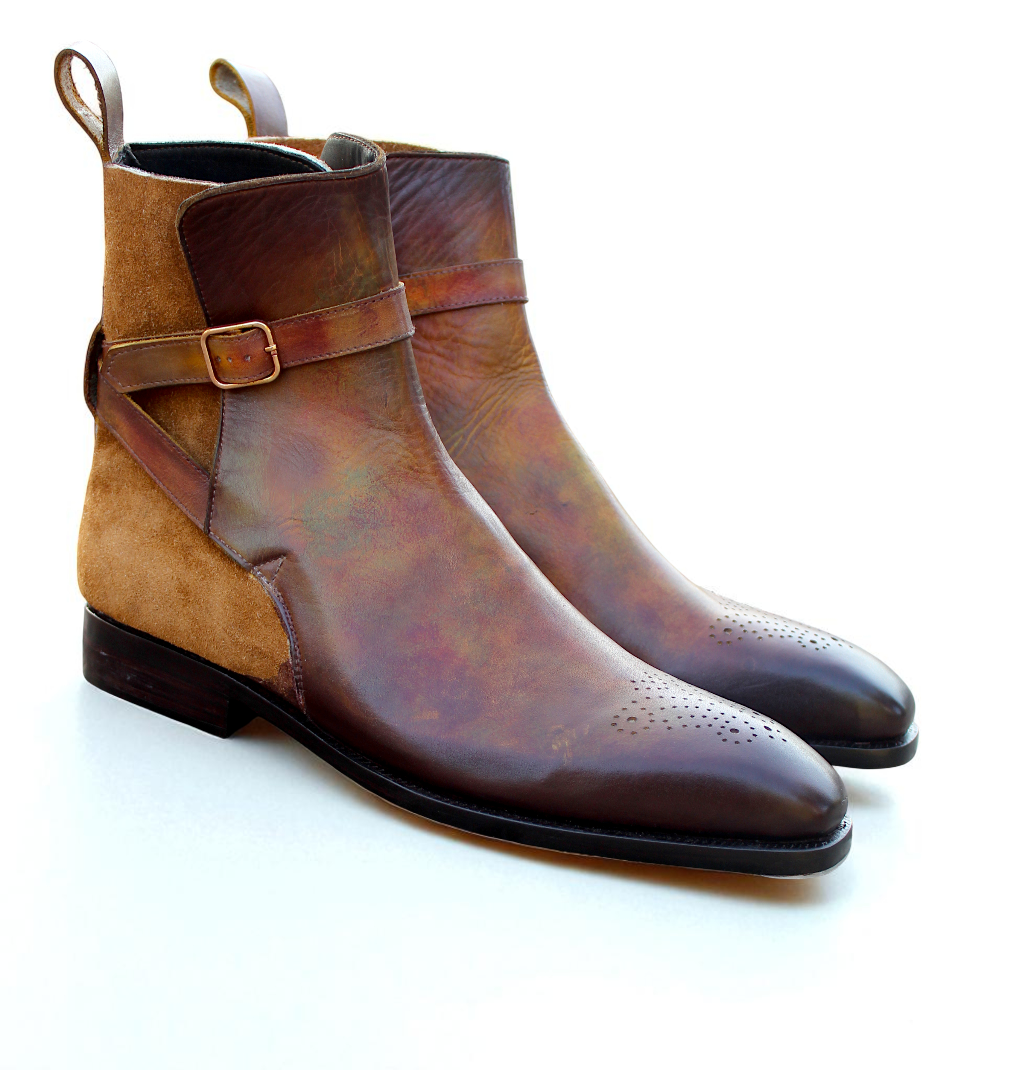 Inner: Soft Leather Sole: Leather Gender : Male Heel: Leather Color: Denim Brown Style: Jodhpur Boot Hand-Painted Patina Leather Upper Calf-Skin Lining Insole Totally Hand stitched Manufacturing time 7-10 business days If you can’t find your Size/Colorjust send us message we will make for you.