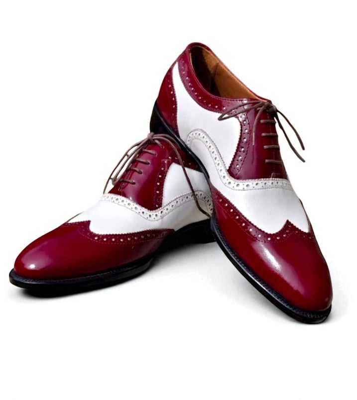 Crafted Leather Classic Burgundy White Leather Wingtip Lace up Oxford Dress Shoes