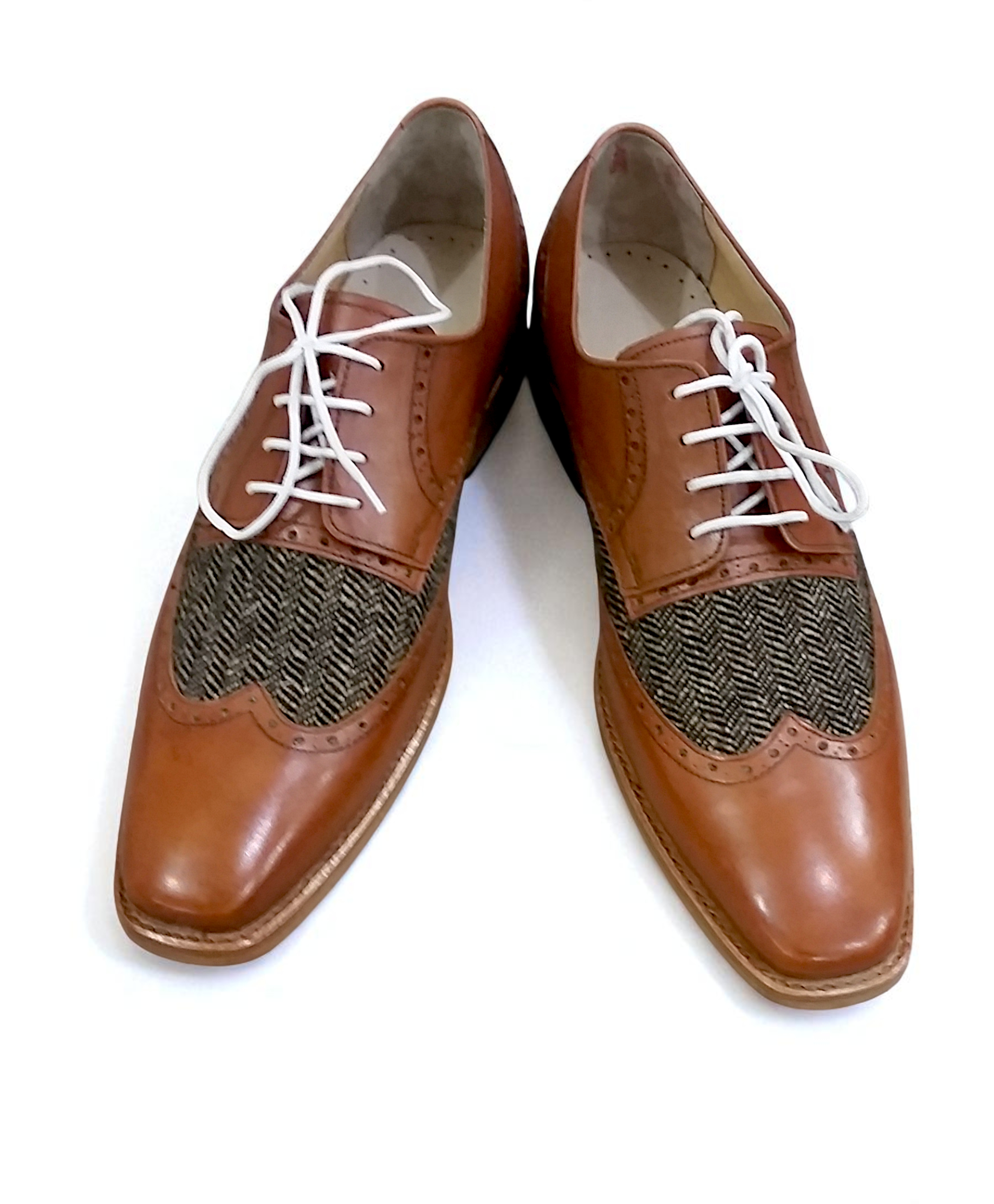 Crafted Leather Classic Brown Leather and Tweed Contrast Wingtip Oxford Dress Lace up Shoes