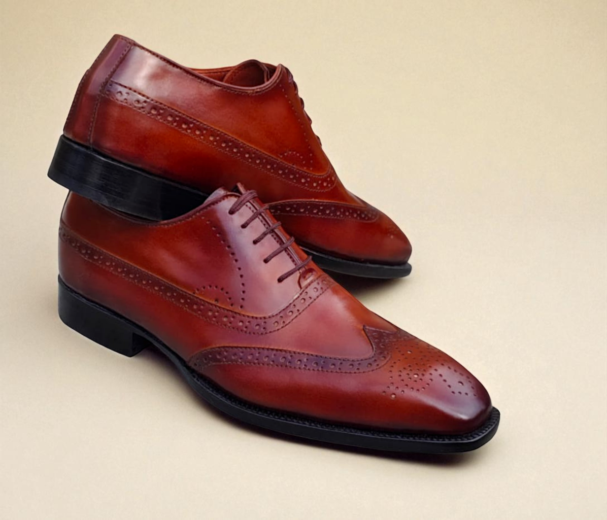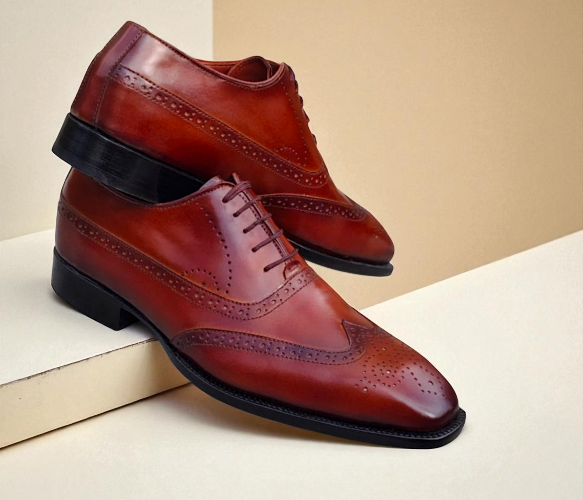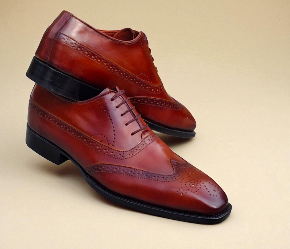 Crafted Leather Classic Brown Patina Leather Wingtip Oxford Dress Shoes