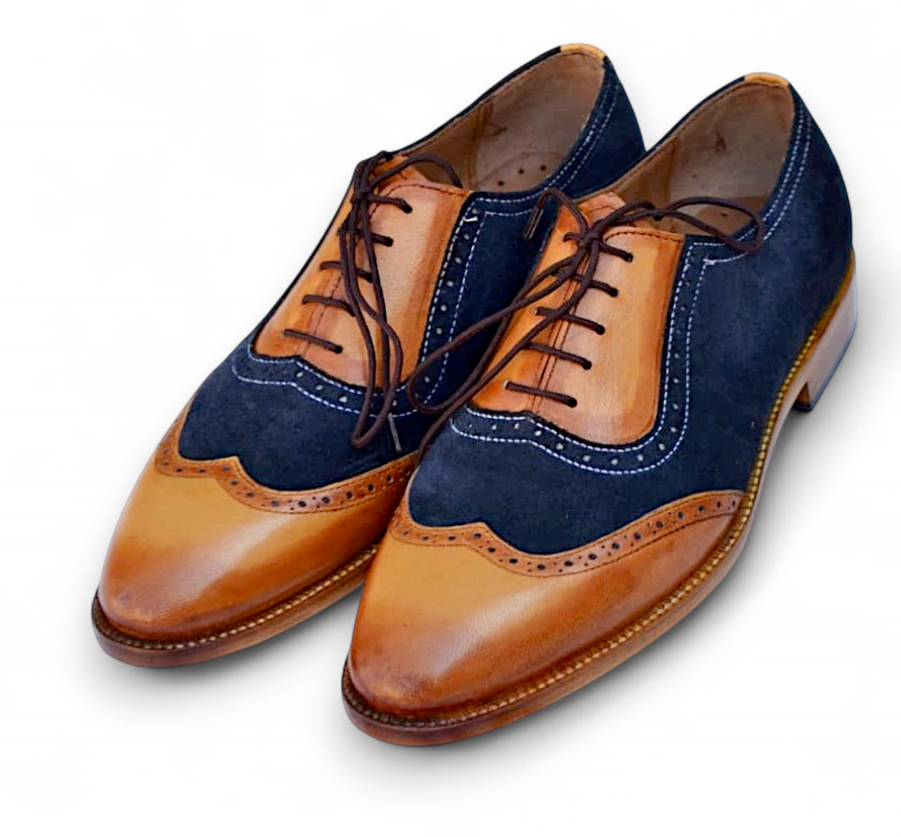 Crafted Leather Brown Blue Suede Leather Handmade Wingtip Oxford Dress Shoes