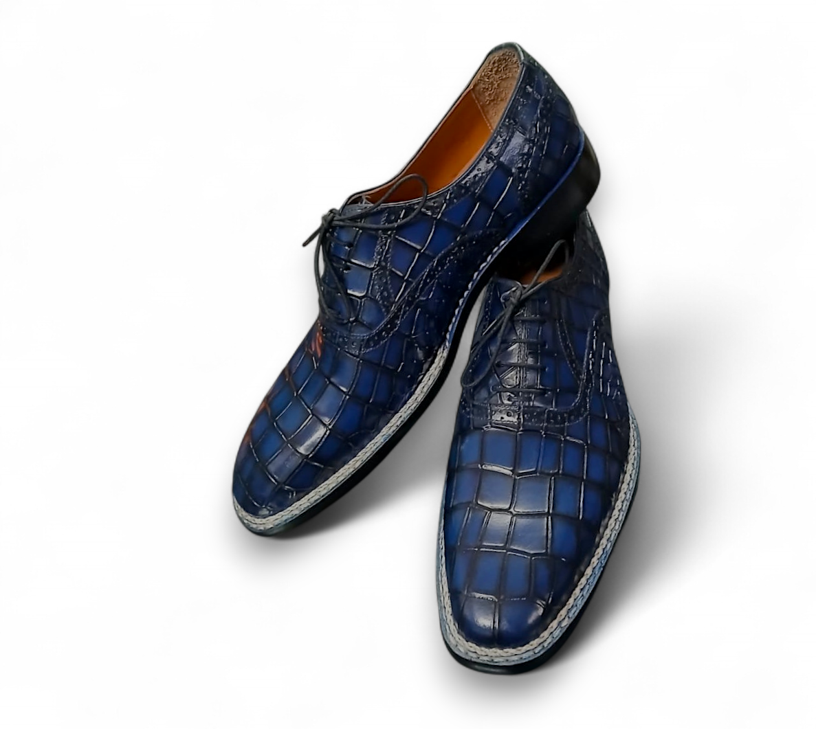 Crafted Leather Classic Handmade Men Norwegian Welted Blue Crocodile Lace up Alligator Dress Shoes
