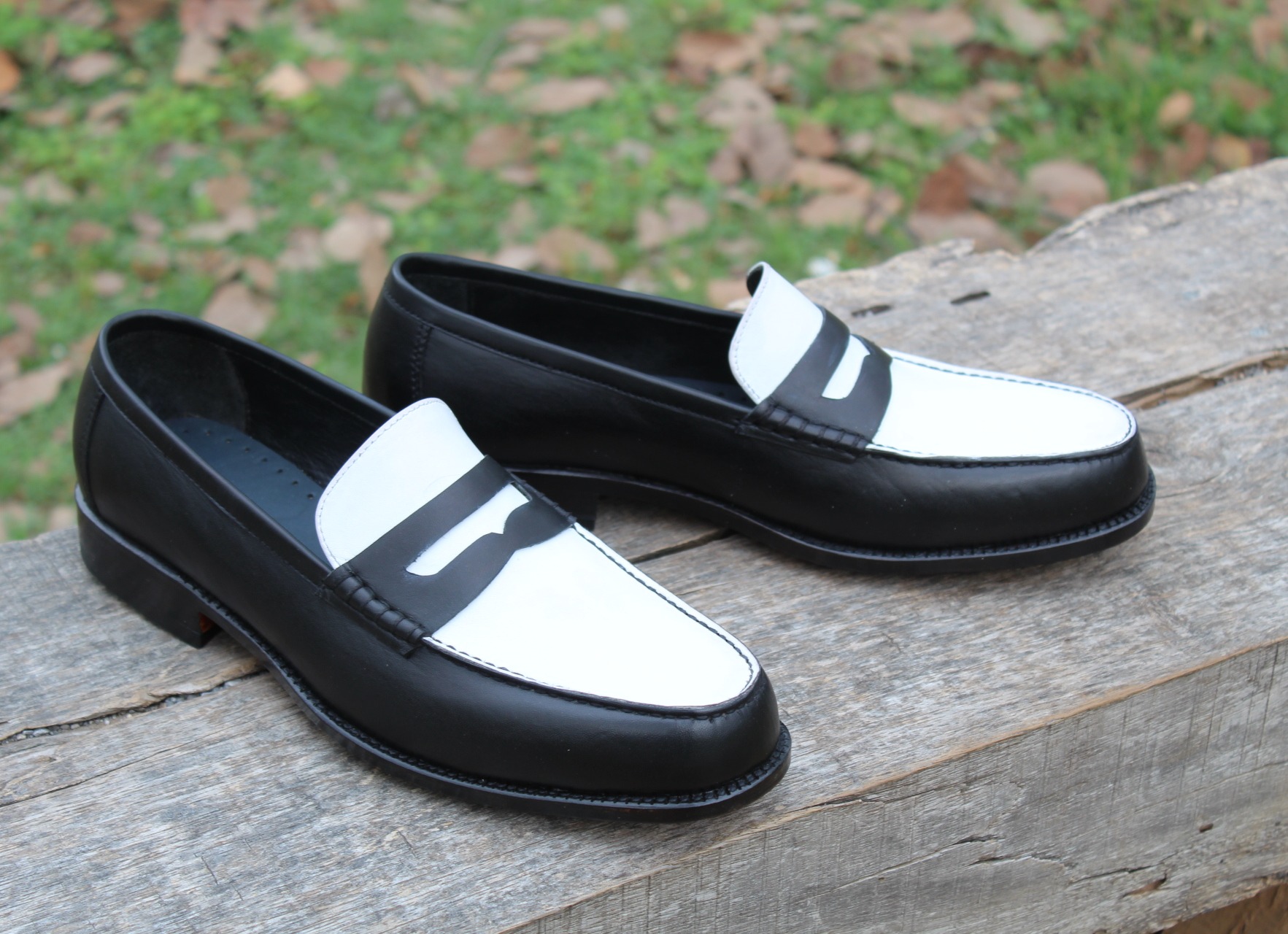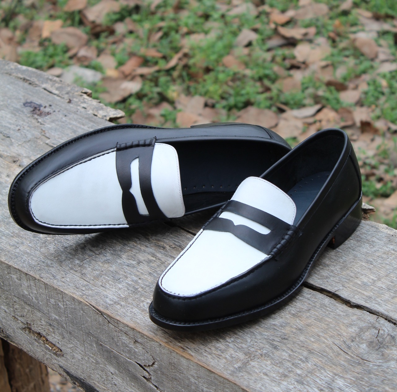 Crafted Leather Handmade Black White Leather Penny Loafer Moccasin Formal Shoes