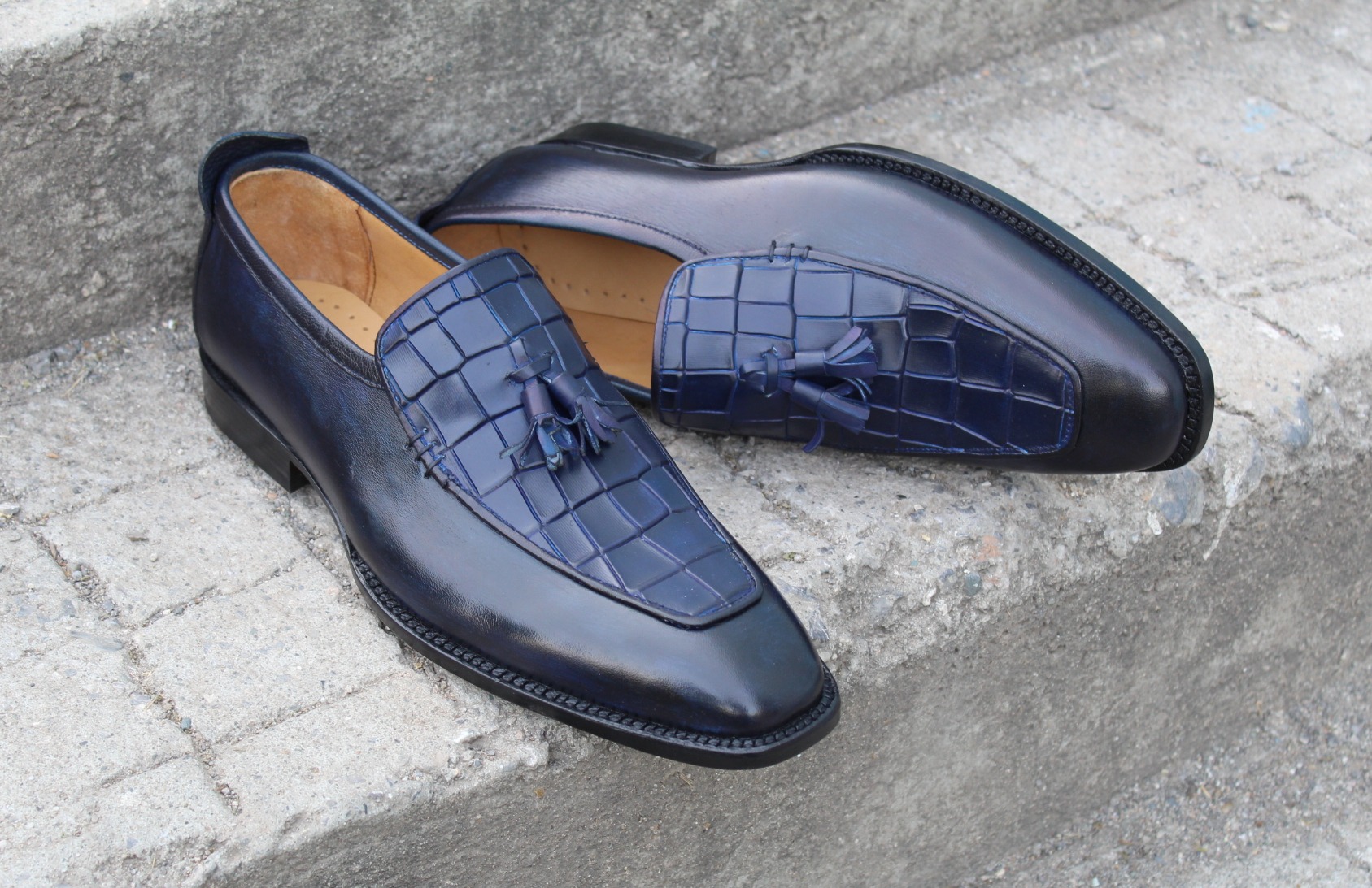 Inner: Soft Leather Sole: Leather Gender : Male Heel: Leather Color: Blue Style: Tassel Loafer Shoes Toe Shape: Apron Toe Totally Hand stitched Manufacturing time 7-10 business days If you can’t find your Size/Color just send us message we will make for you.