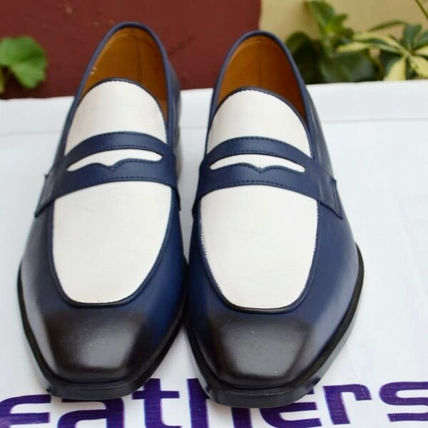 Inner: Soft Leather Sole: Leather ( Goodyear Welt ) Gender : Male Heel: Leather Color: Blue / White Style: Slip On Loafers Moccasins Shoes Lining Soft Calf Leather Lining Totally Hand stitched Manufacturing time 7-10 business days If you can’t find your Size/Color just send us message we will make for you.