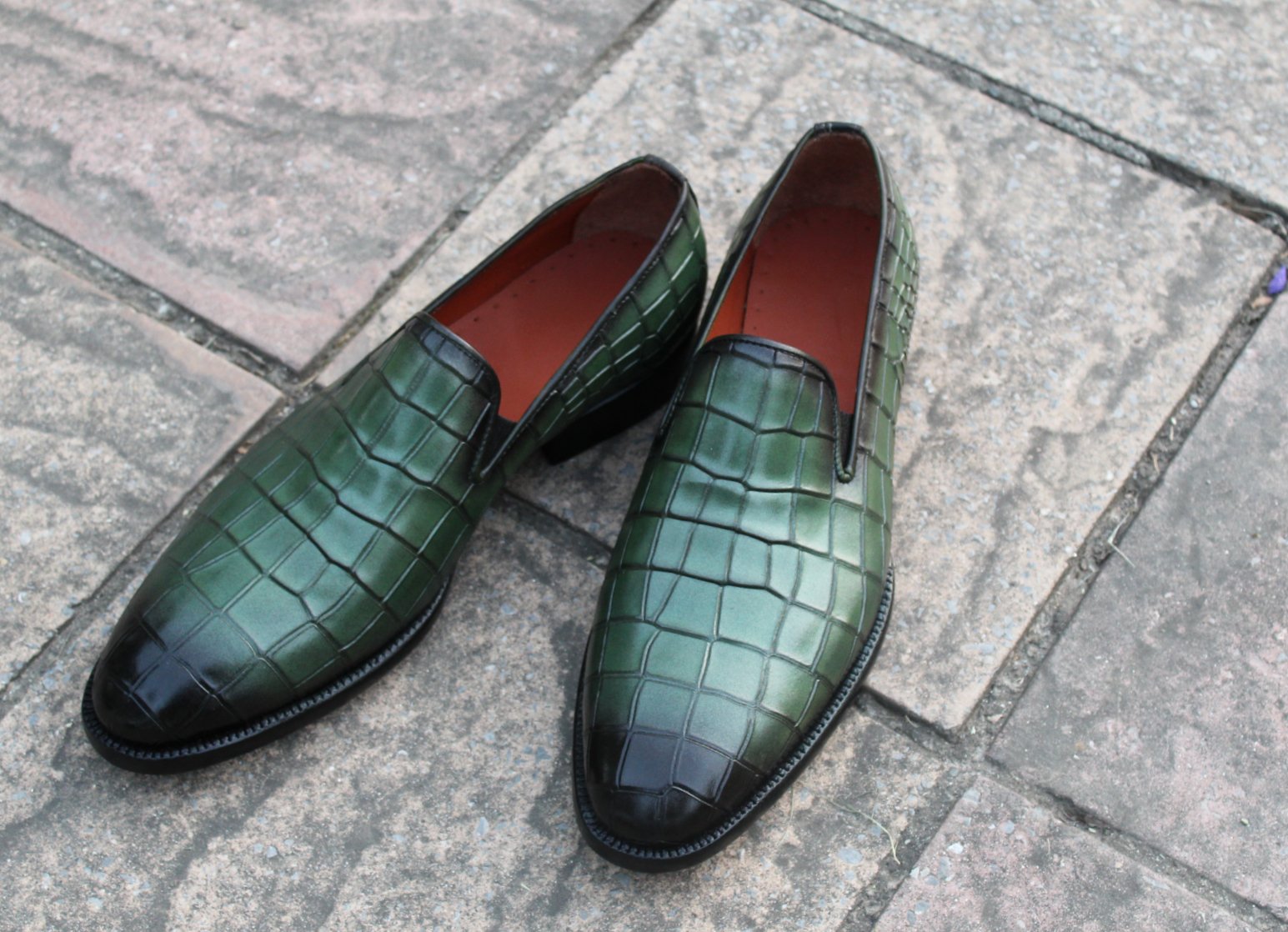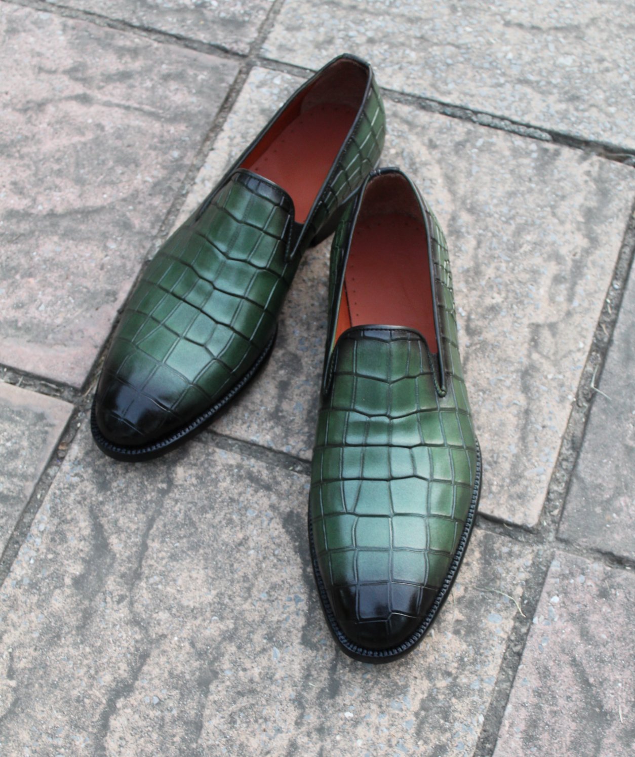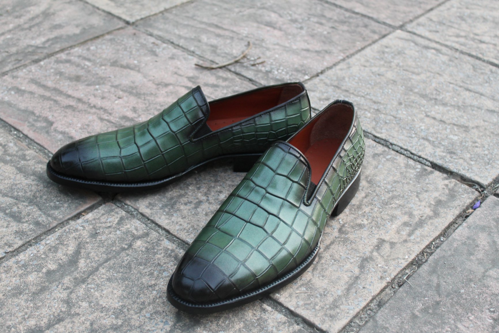 Crafted Leather Classic Handmade Men Green Crocodile/Alligator Loafers Dress Shoes