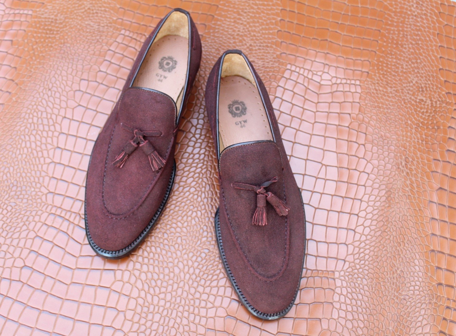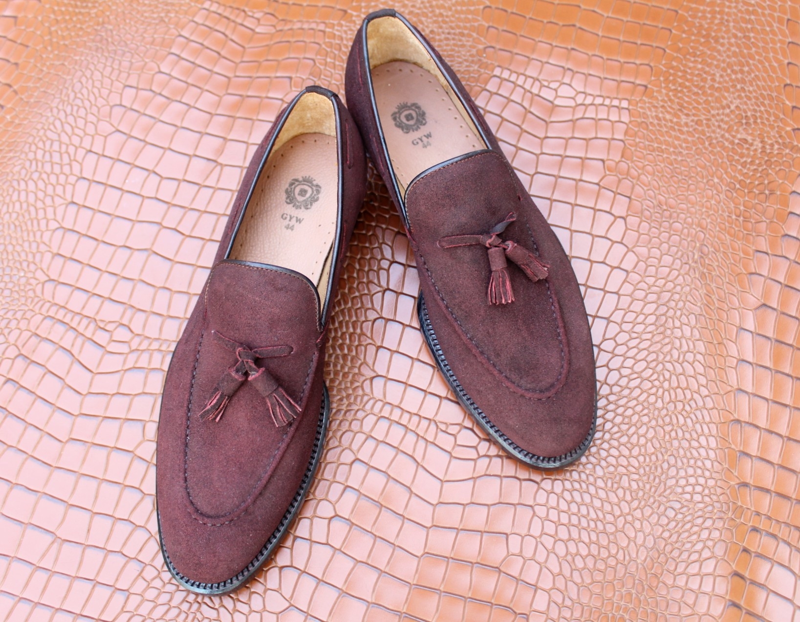 Crafted Leather Handmade Men Classic Tassels Loafers Maroon Suede Leather Dress Shoes