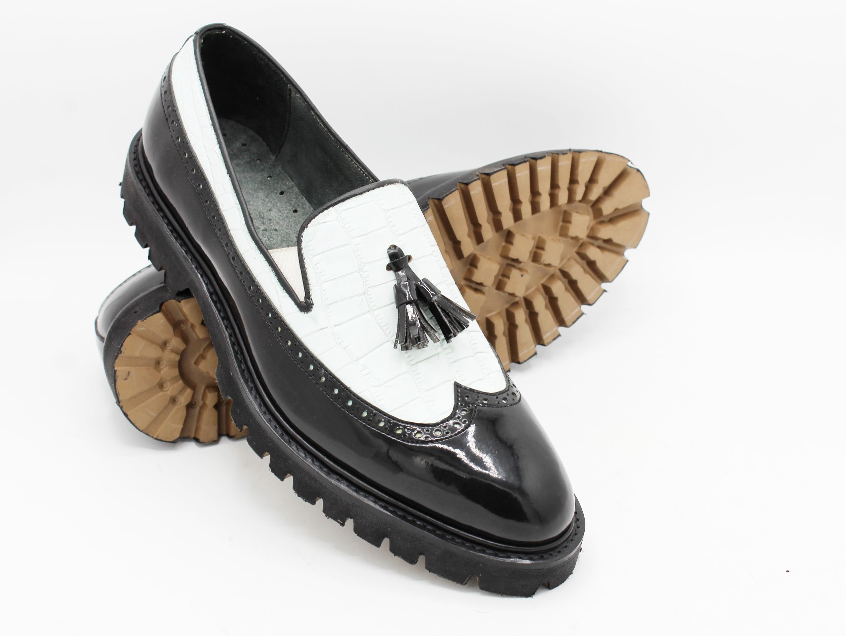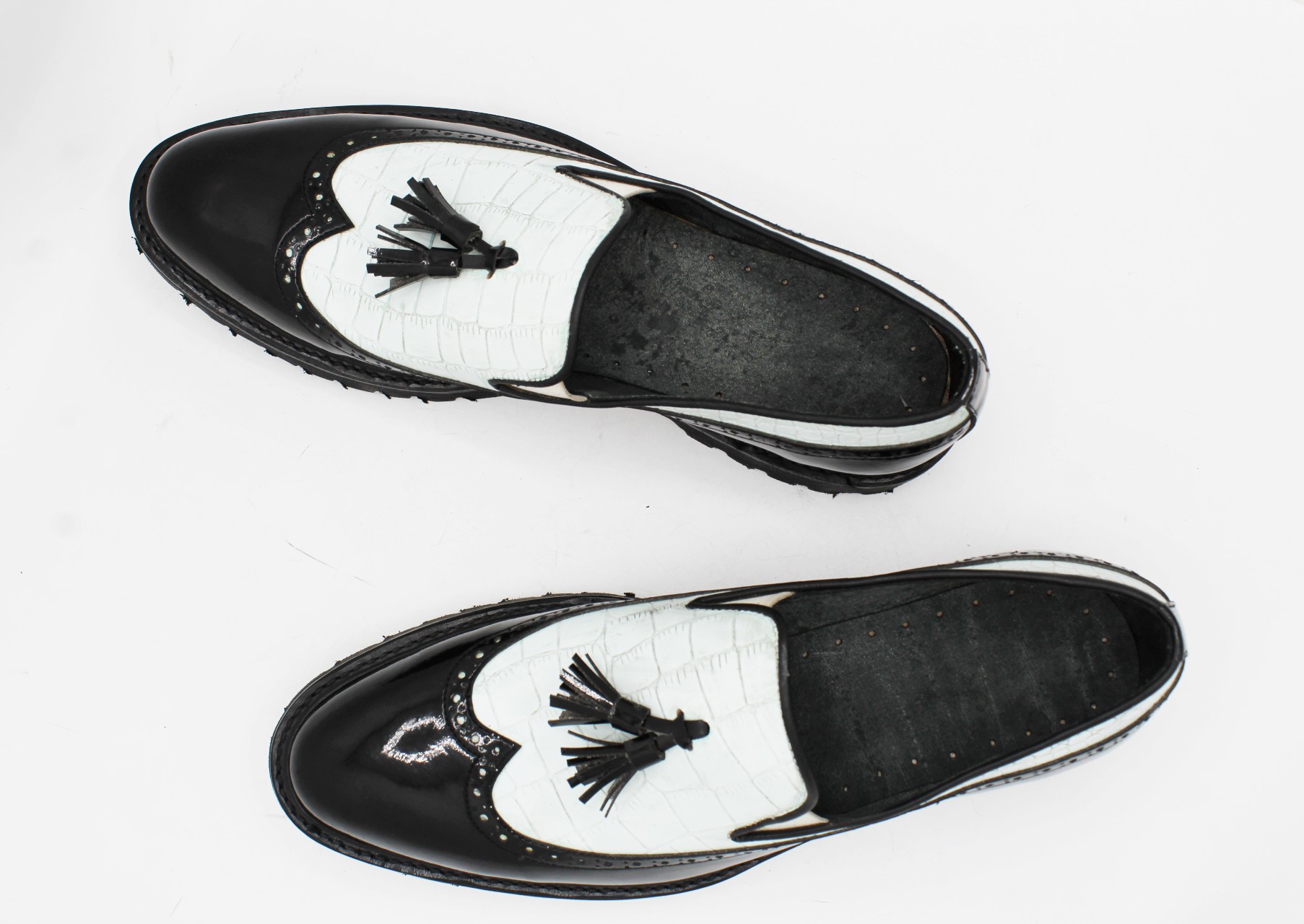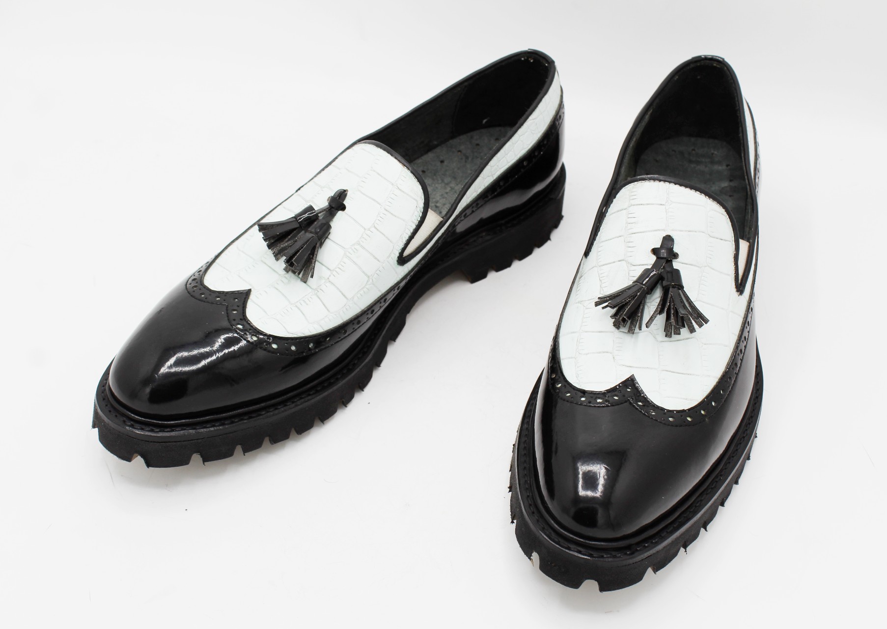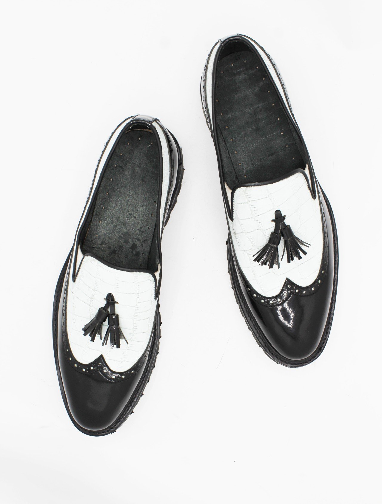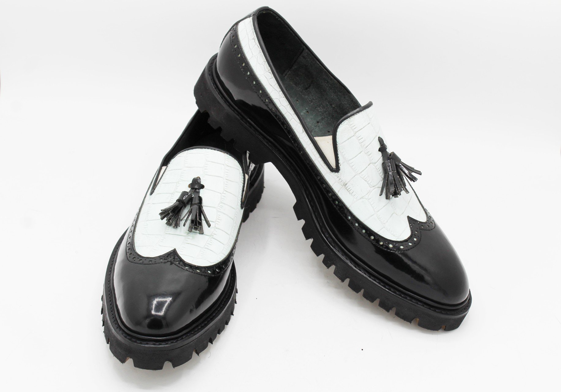 Unique Black Patent and White Crocodile Contrast Tassel Loafers Men Wingtip Dress Shoes