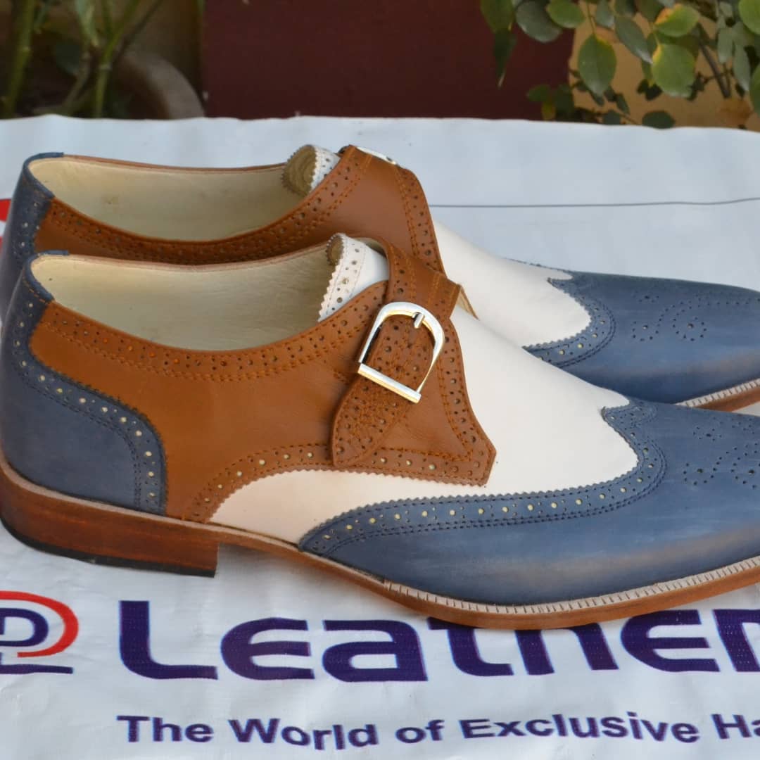 Inner: Soft Leather Sole: Leather Gender : Male Heel: Leather Color: Brown, Blue & White Style: Monk Strap Shoes Lining Soft Calf Leather Lining Totally Hand stitched Manufacturing time 7-10 business days If you can’t find your Size/Colorjust send us message we will make for you.