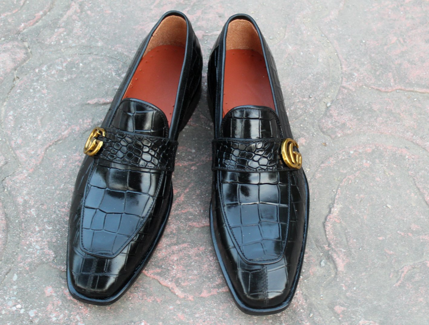 Crafted Leather Classic Handmade Black Crocodile/Alligator Moccasin Dress Formal Loafers Shoes