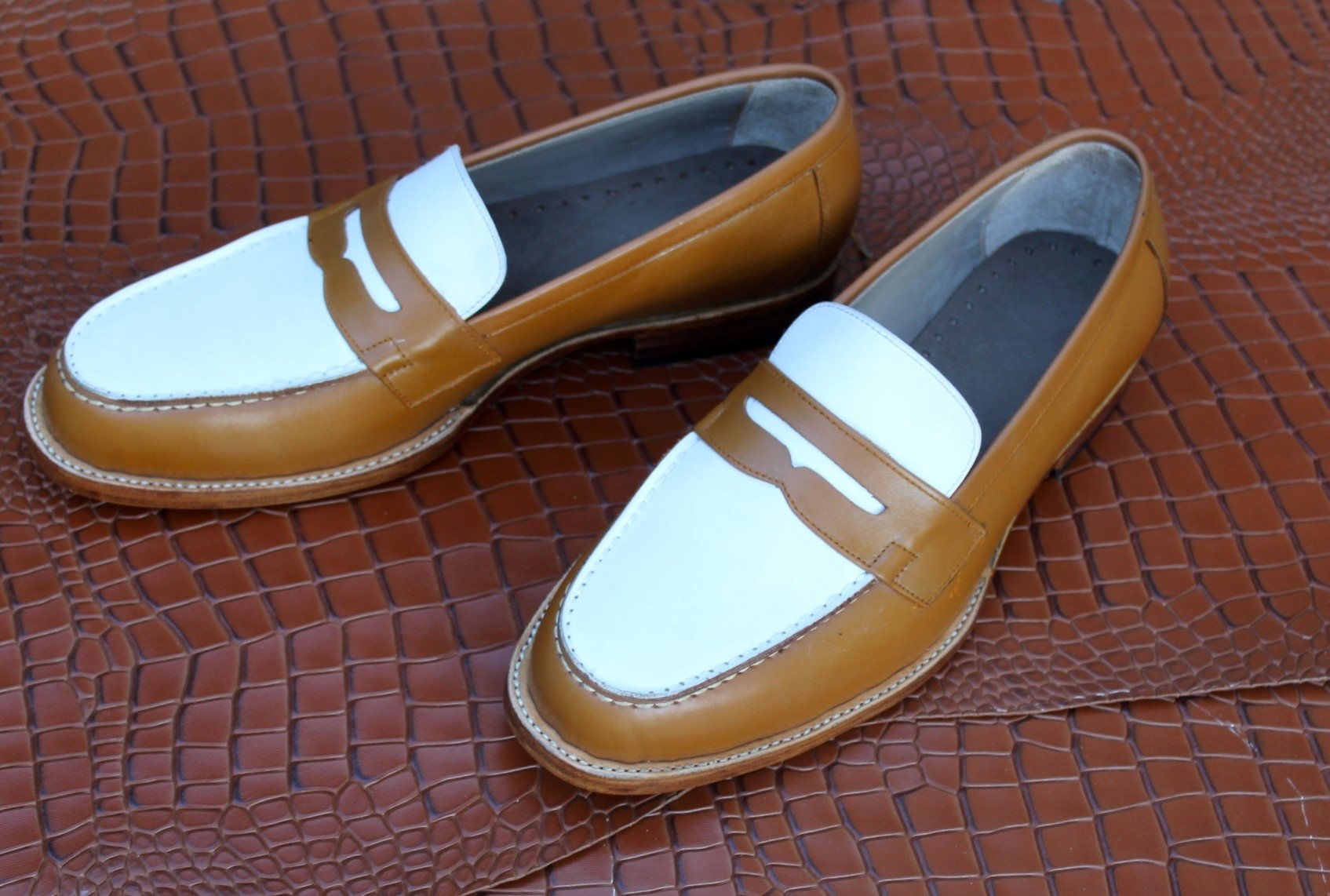 Inner: Soft Leather Sole: Leather Gender : Male Heel: Leather Color: Brown / White Style: Loafers Shoes Lining Soft Calf Leather Lining Totally Hand stitched Manufacturing time 7-10 business days If you can’t find your Size/Colorjust send us message we will make for you.