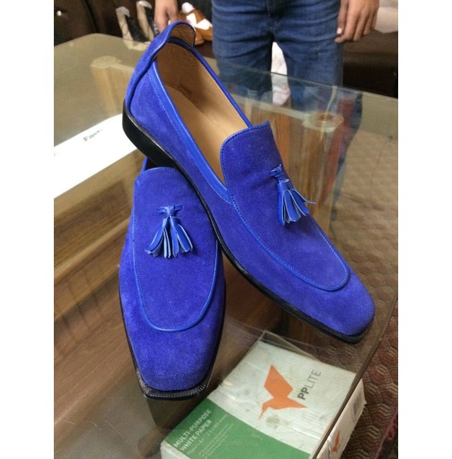 Royal Blue Tassel Loafer Slip Ons Handmade Men Suede Leather Shoes