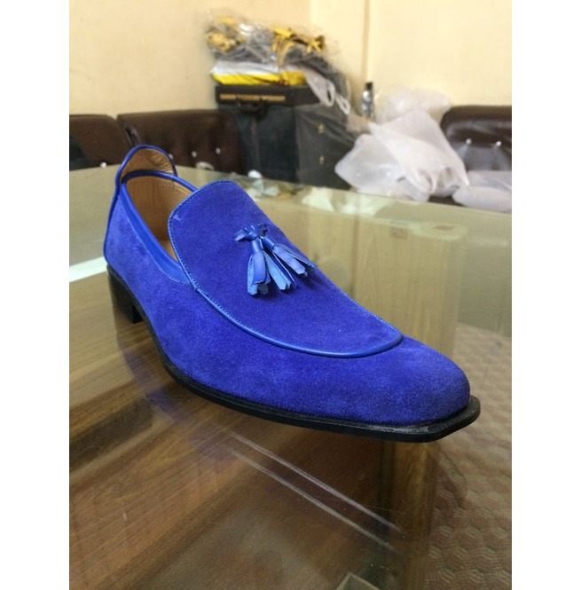 Inner: Soft Leather Sole: Leather Gender : Male Heel: Leather Color: Royal Blue Style: Tassel Loafer Shoes Totally Hand stitched Manufacturing time 7-10 business days If you can’t find your Size/Color just send us message we will make for you.