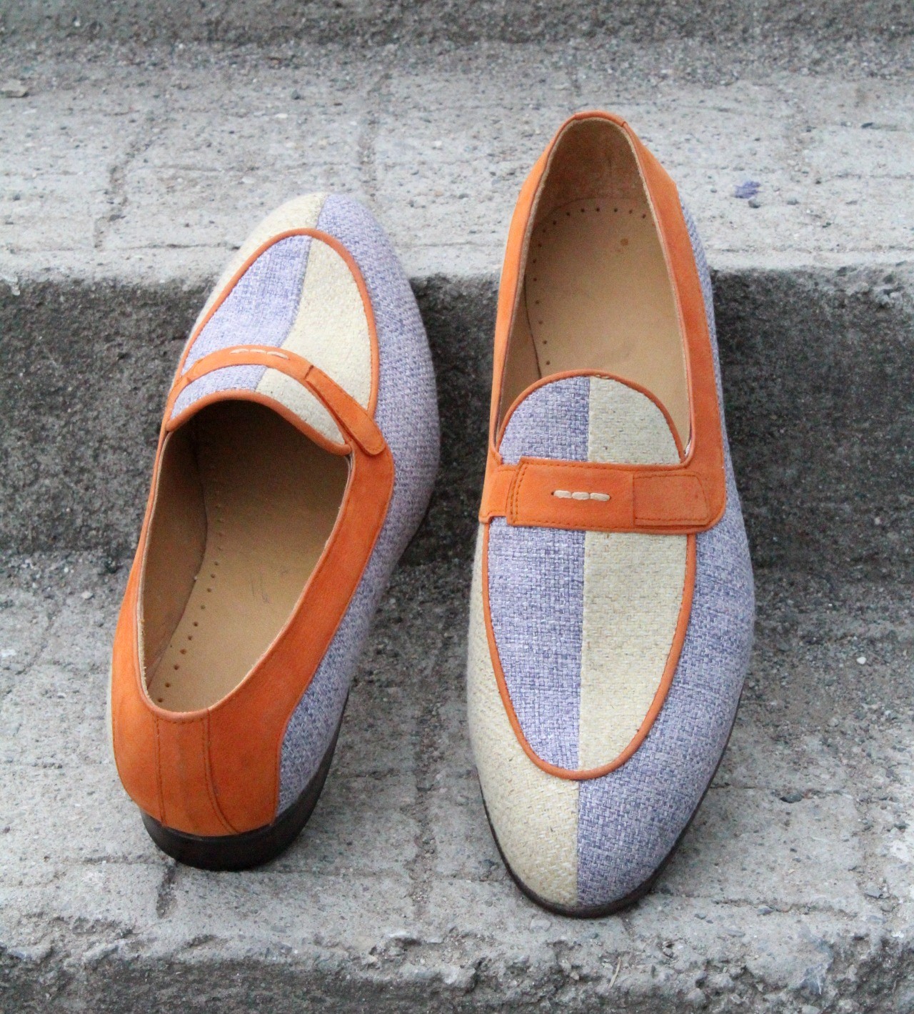 Crafted Leather Bespoke Custom Men Moccasin Dress Shoes Blue Beige Linen Fabric Belgian Loafers
