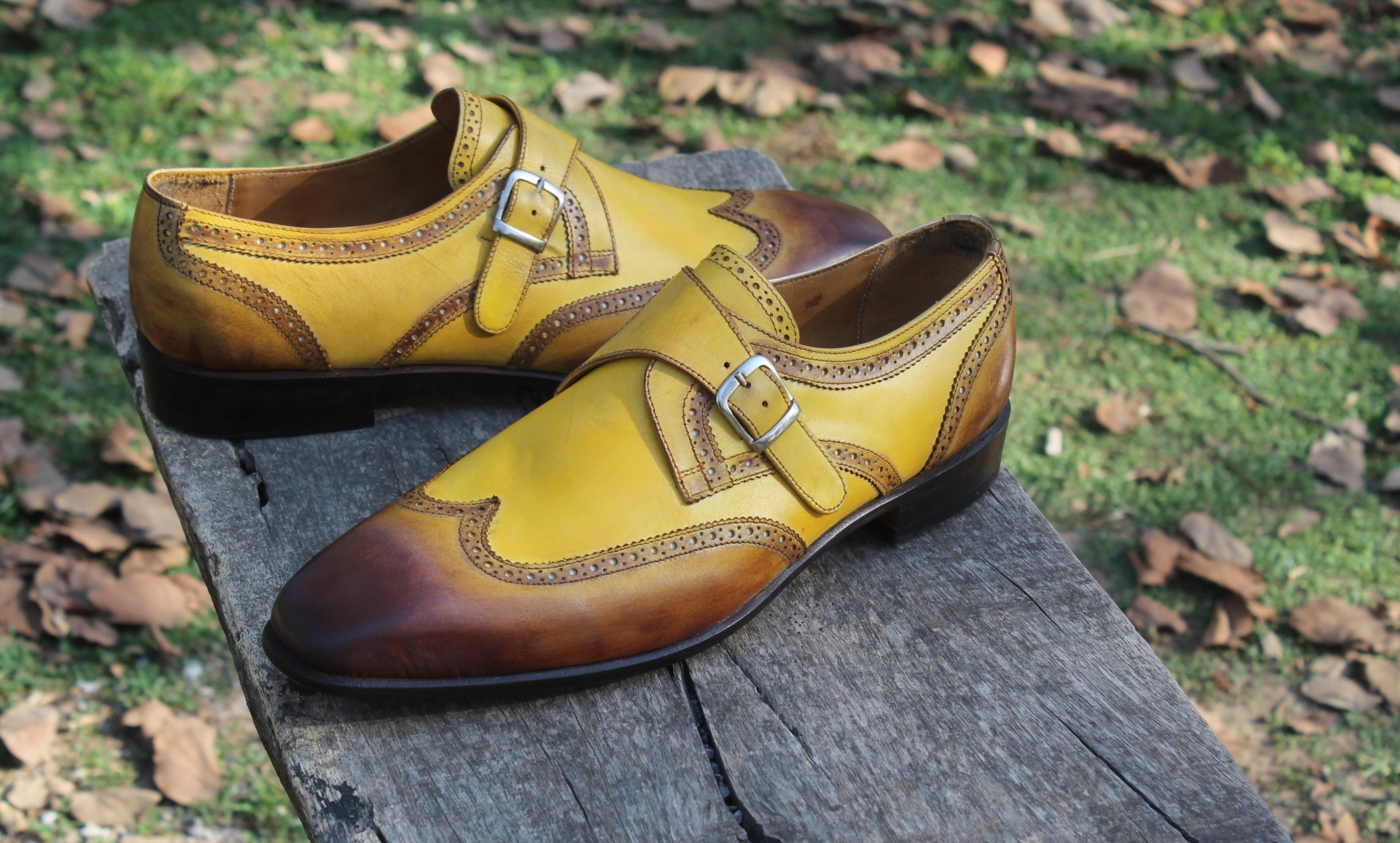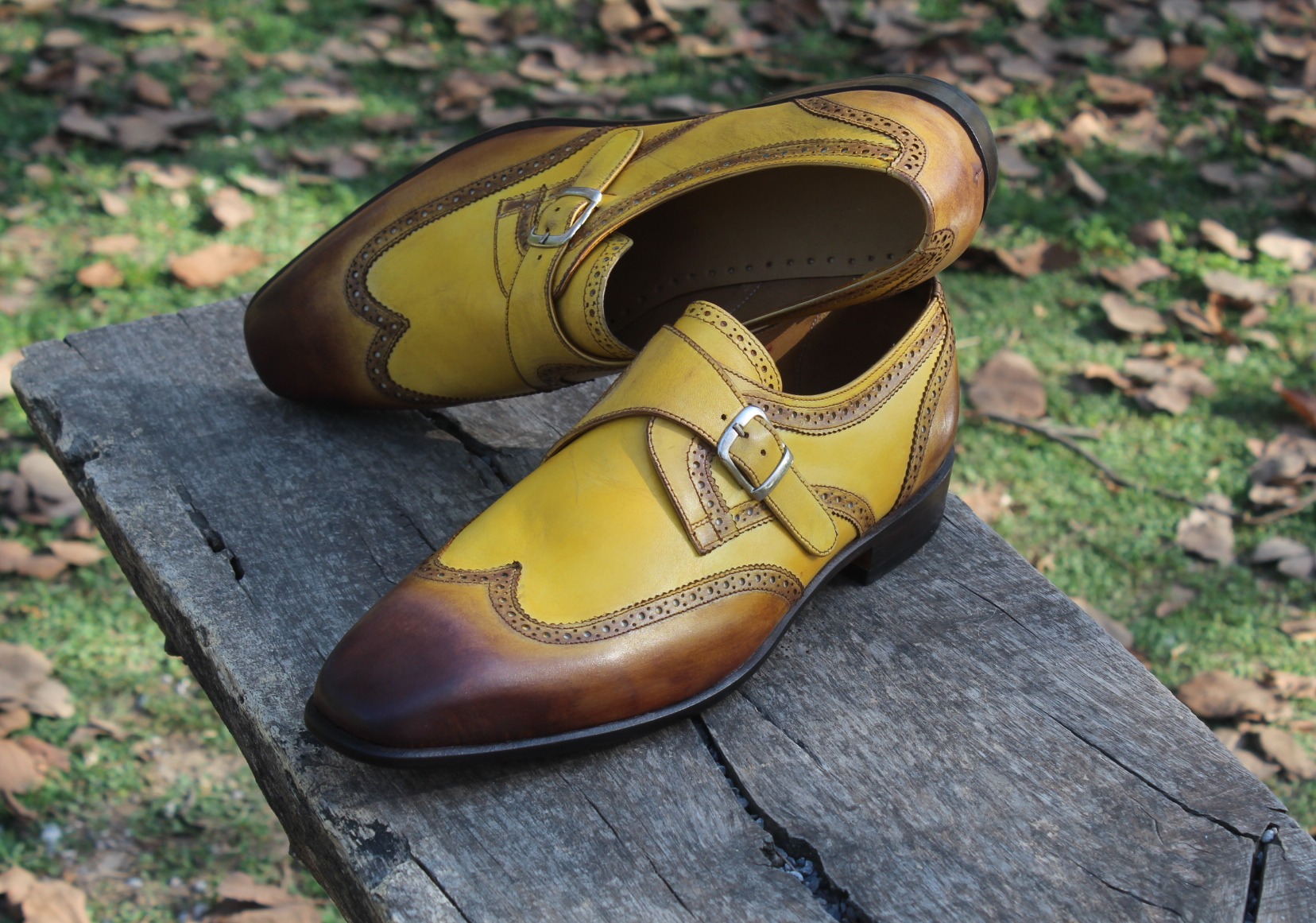 Inner: Soft Leather Sole: Leather ( Goodyear Welted ) Gender : Male Heel: Leather Color: Tan / Brown Style: Monk Strap Wingtip Shoes Totally Hand stitched Manufacturing time 7-10 business days If you can’t find your Size/Color just send us message we will make for you.