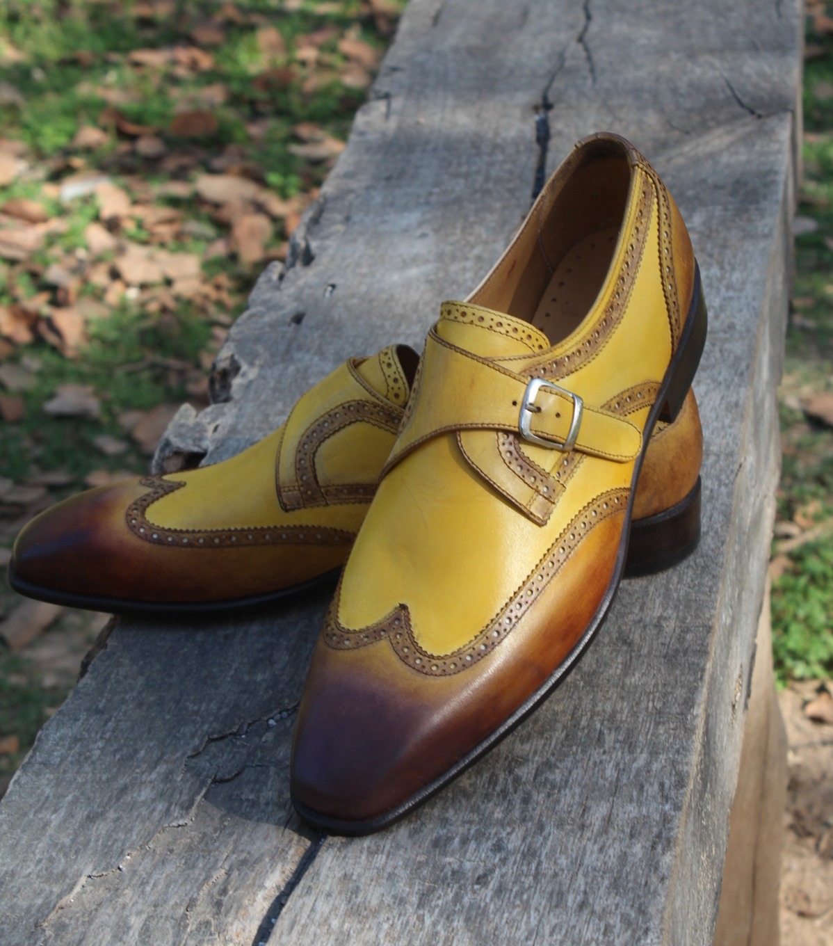 Inner: Soft Leather Sole: Leather ( Goodyear Welted ) Gender : Male Heel: Leather Color: Tan / Brown Style: Monk Strap Wingtip Shoes Totally Hand stitched Manufacturing time 7-10 business days If you can’t find your Size/Color just send us message we will make for you.