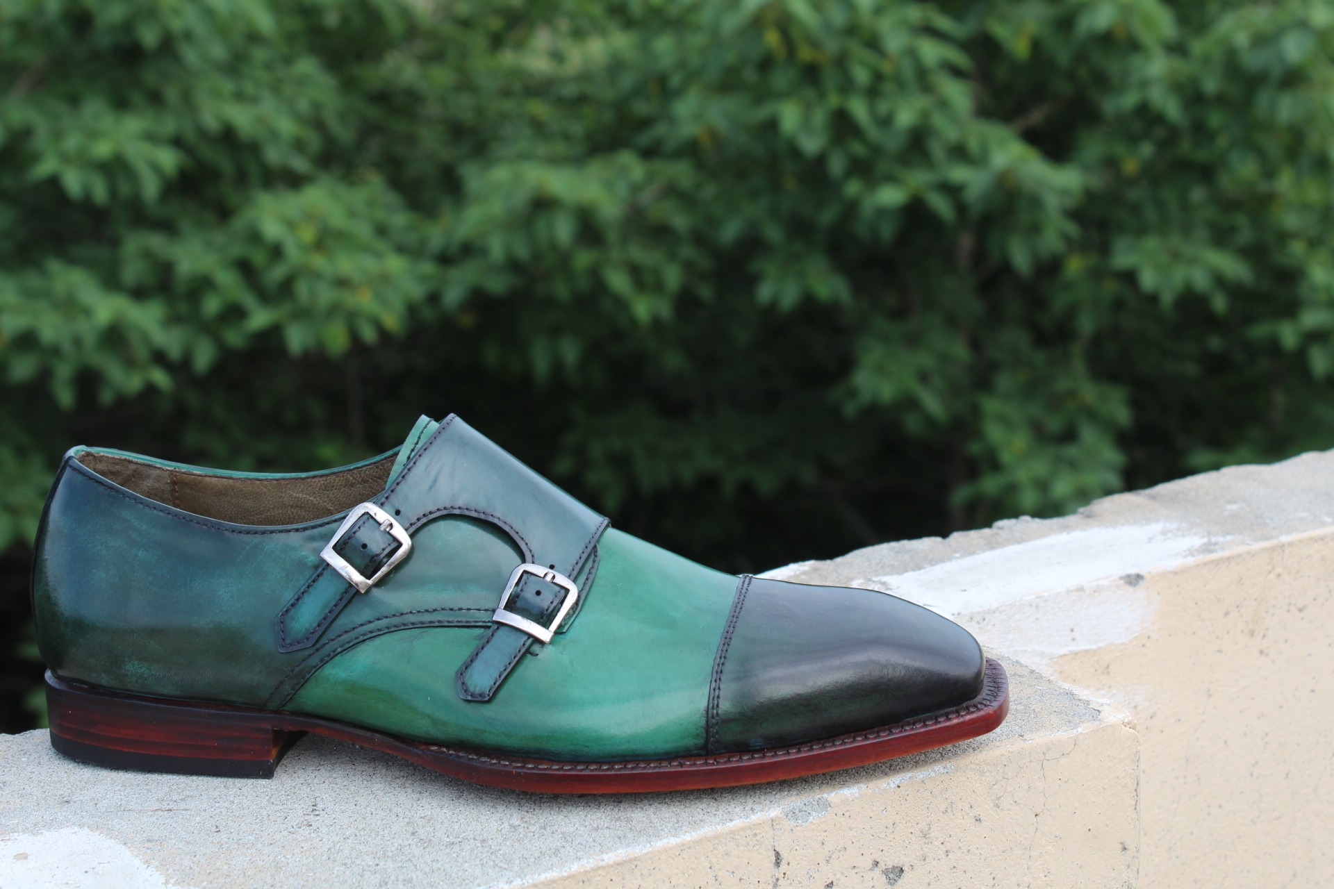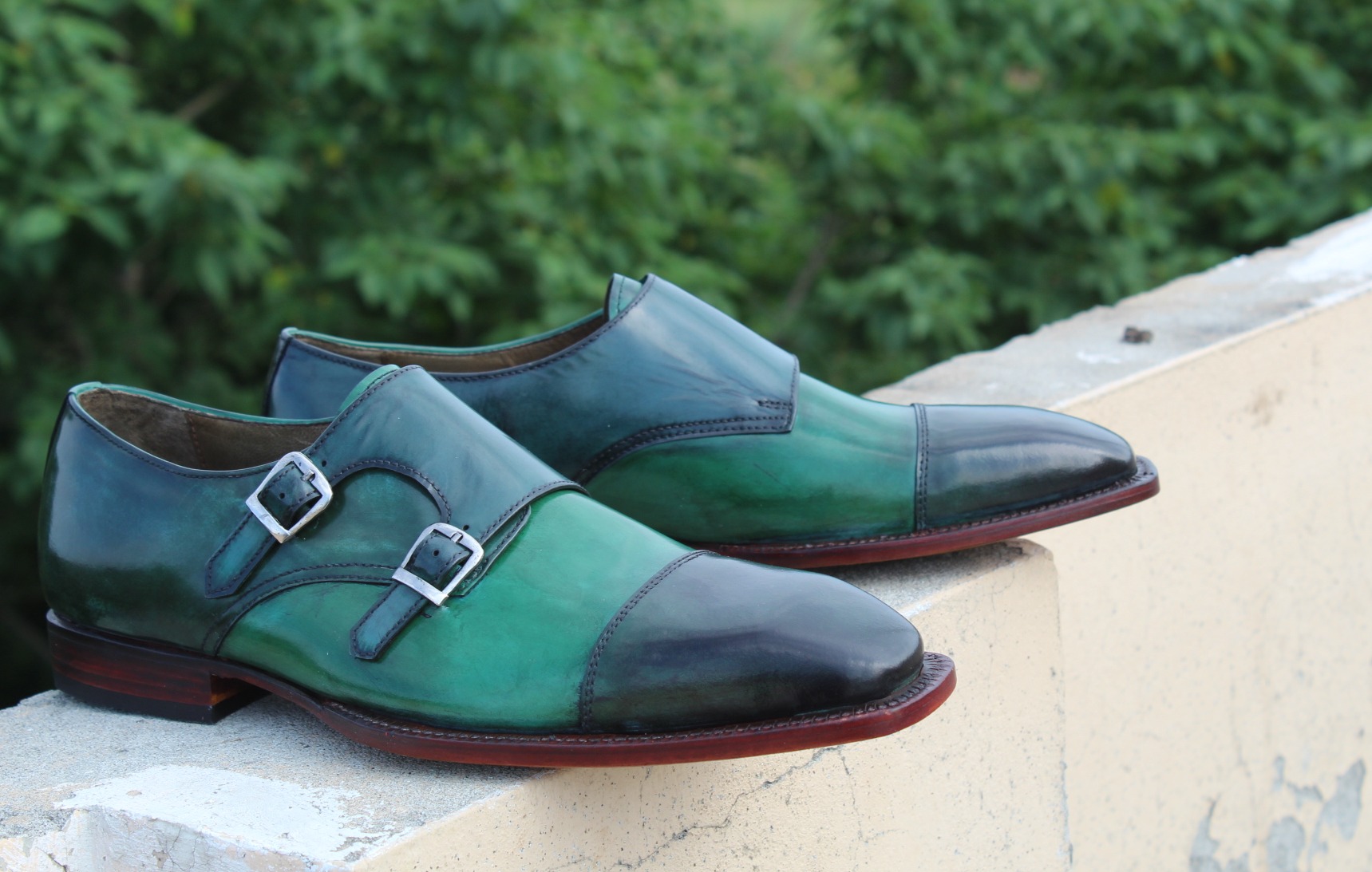 Crafted Leather Classic Handmade Double Monk Strap Dress Shoes in Green Color