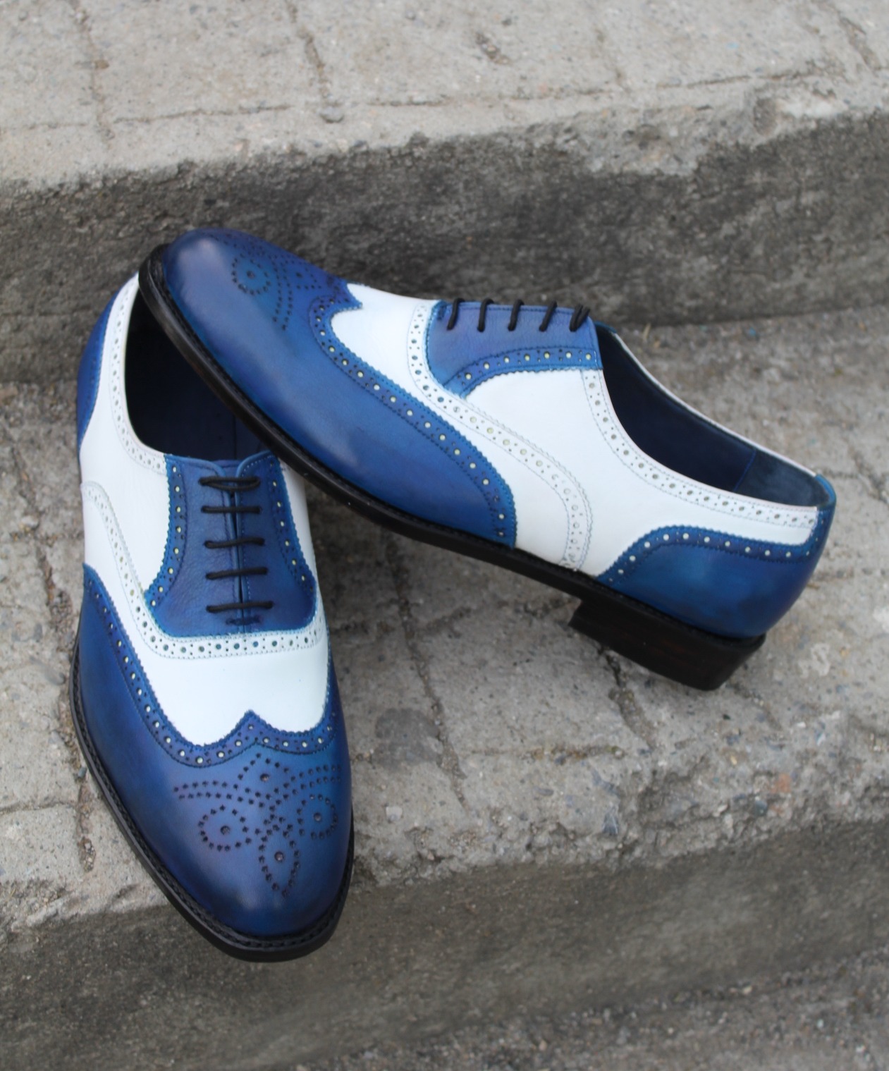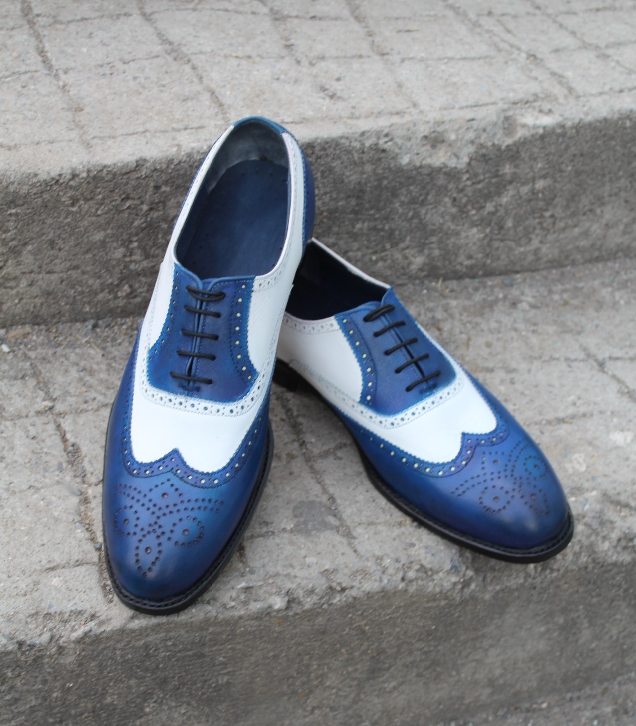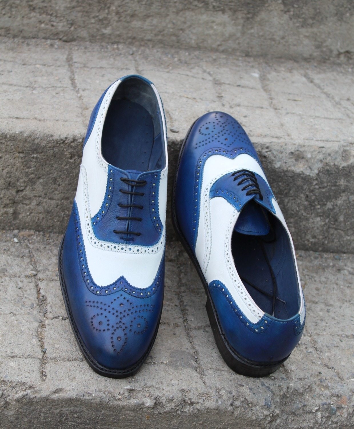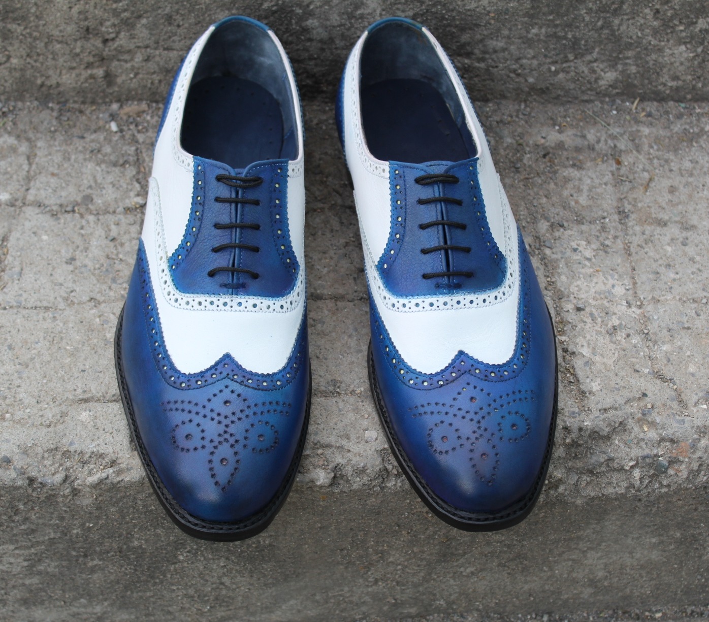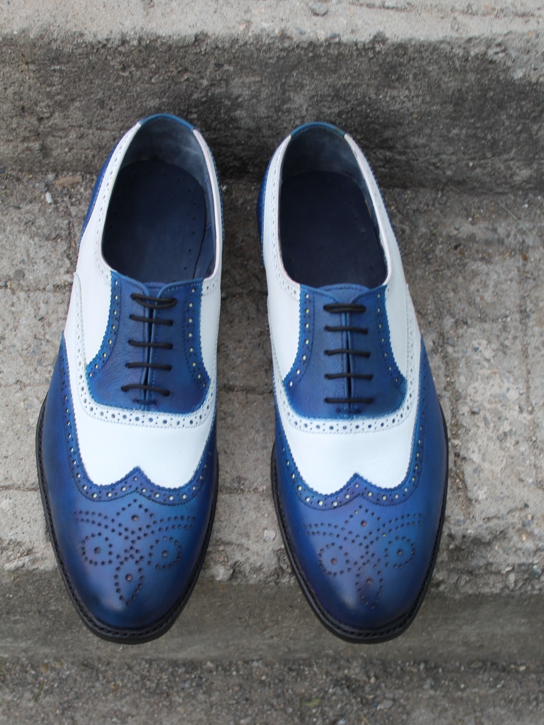 Crafted Leather Bespoke Handmade Men Dress Shoes Blue White Leather Wingtip Oxford