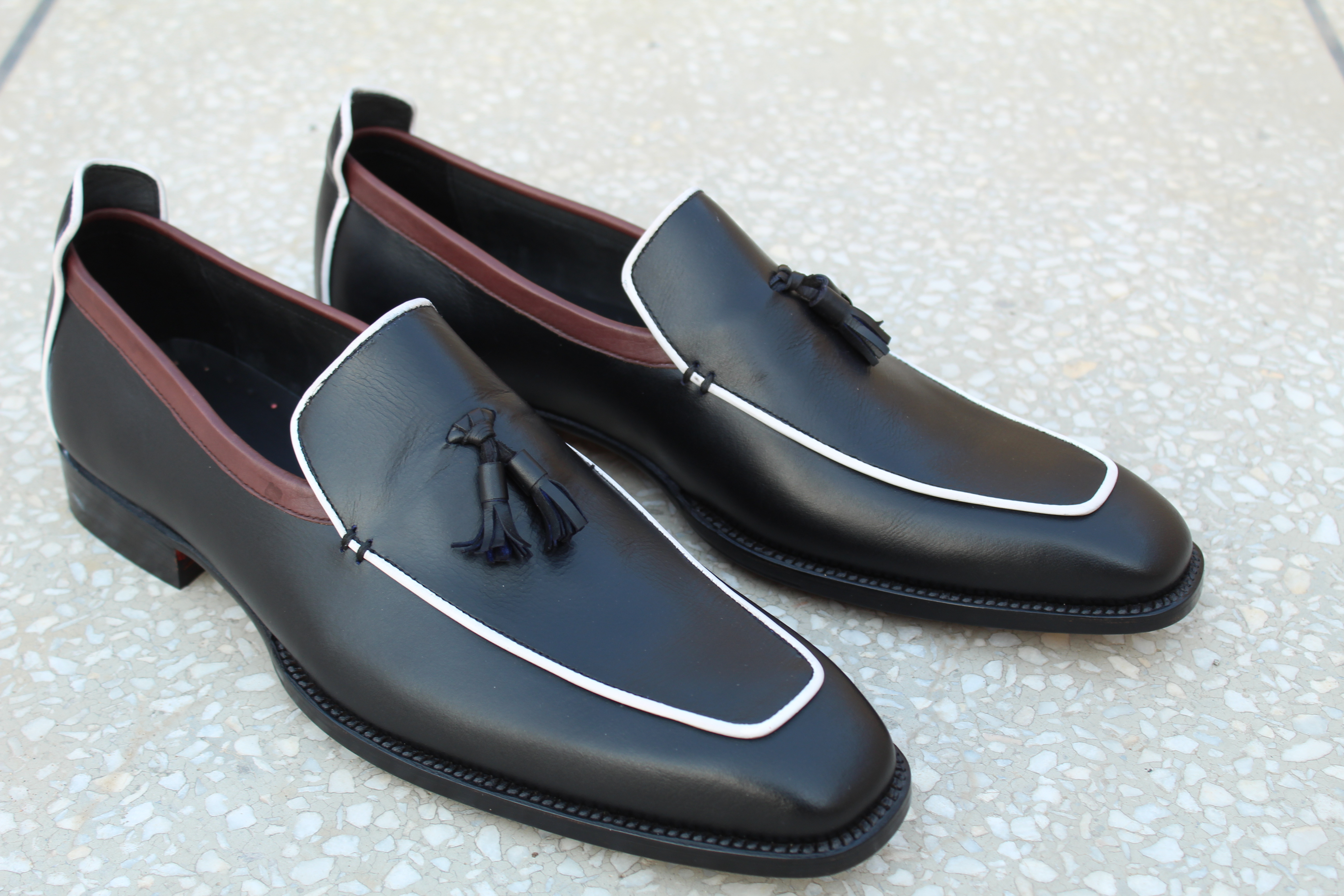 Inner: Soft Leather Sole: Leather Gender : Male Heel: Leather Color: Black Style: Tassel Loafers Shoes Lining Soft Calf Leather Lining Totally Hand stitched Manufacturing time 7-10 business days If you can’t find your Size/Colorjust send us message we will make for you.