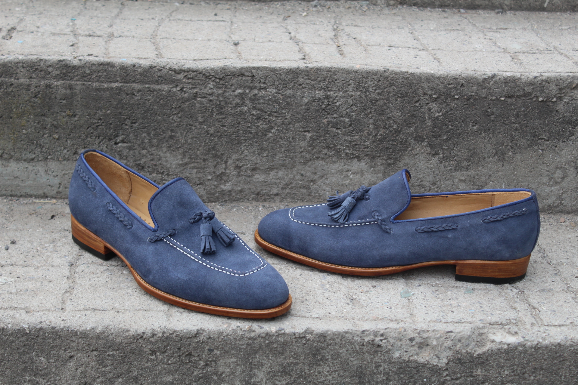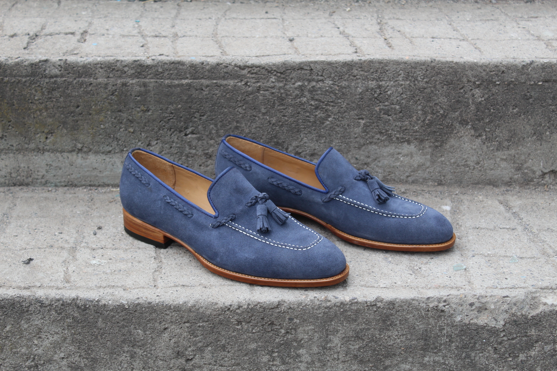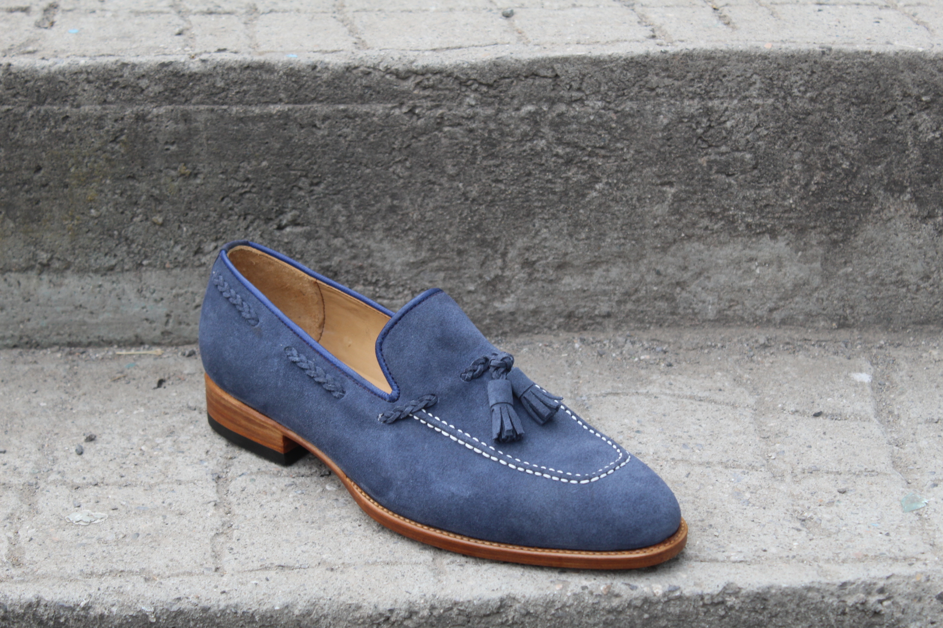 Inner: Soft Leather Sole: Leather ( Goodyear Welted ) Gender : Male Heel: Leather Color: Blue Style: Tassel Loafers Shoes Totally Hand stitched Manufacturing time 7-10 business days If you can’t find your Size/Colorjust send us message we will make for you.