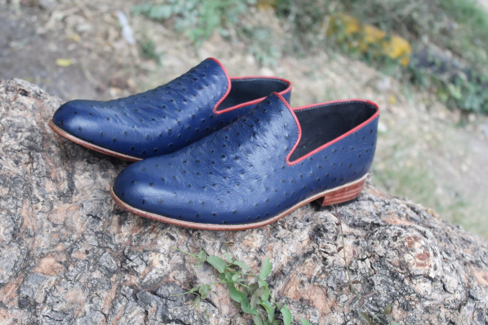 Crafted Leather Classic Blue Ostrich Leather Moccasin Loafers Dress Shoes