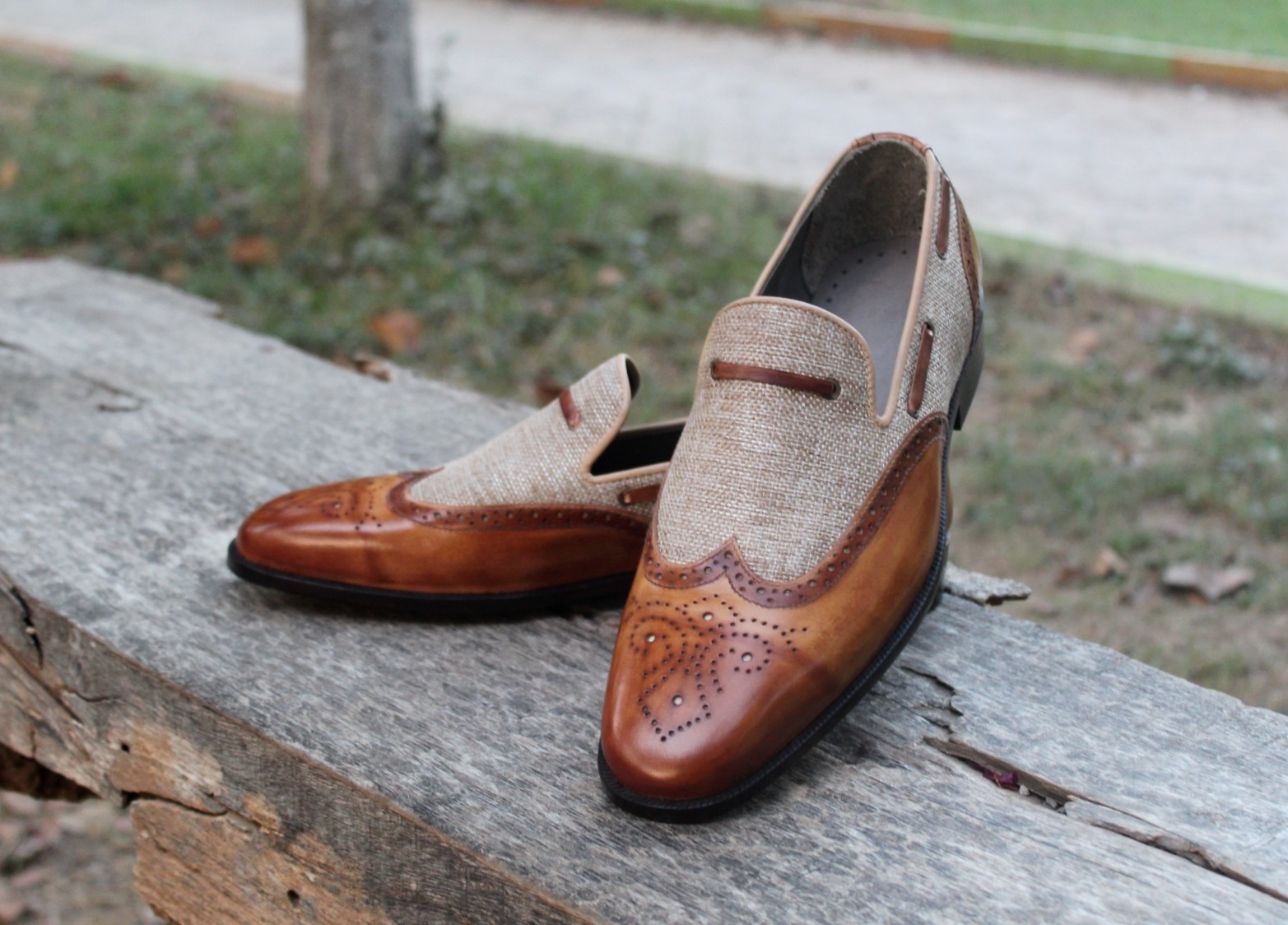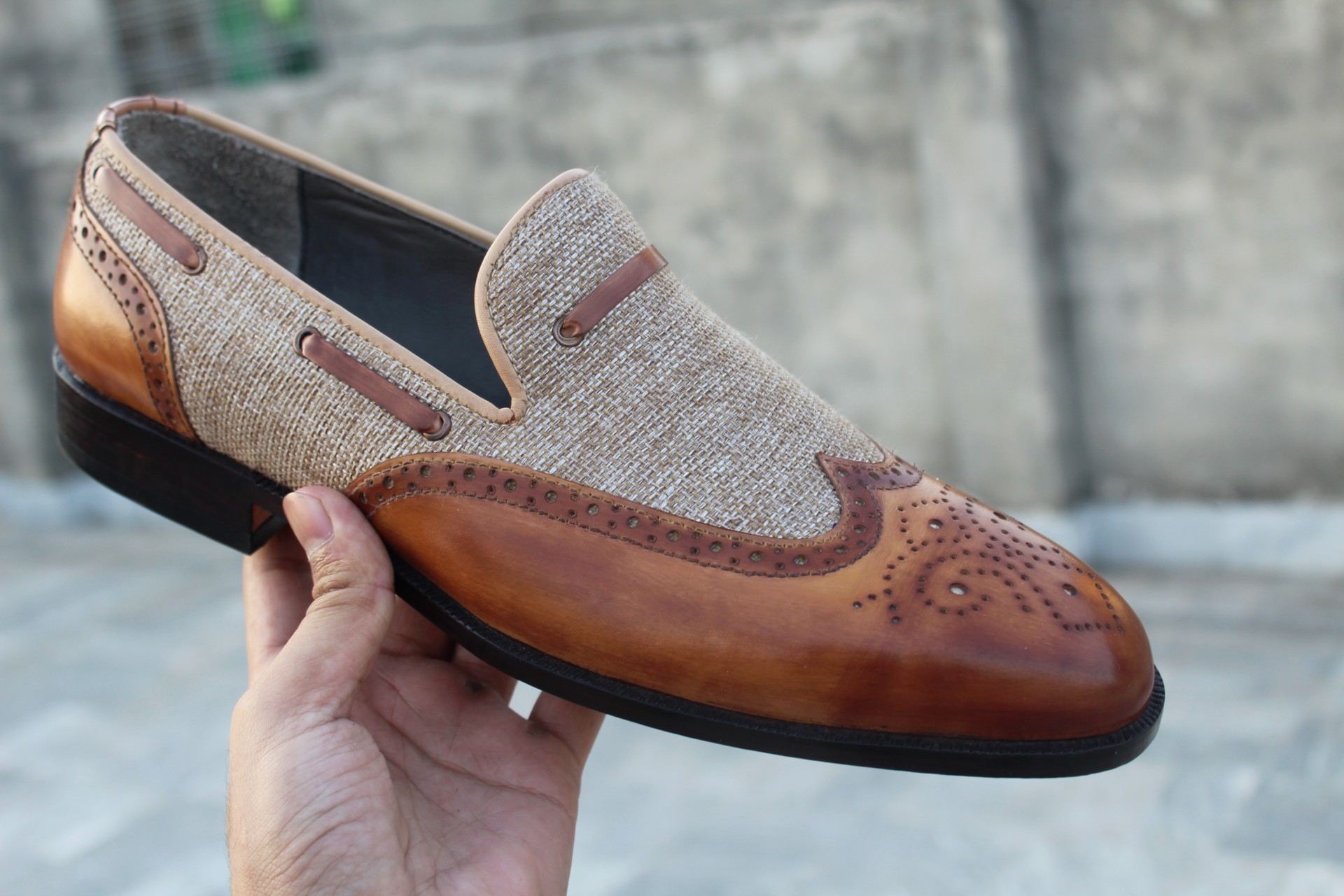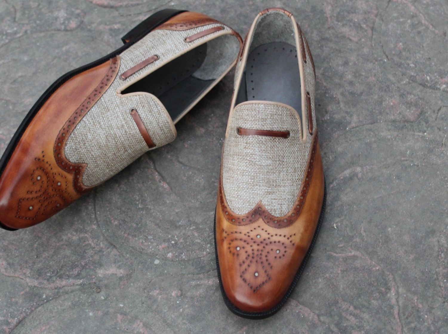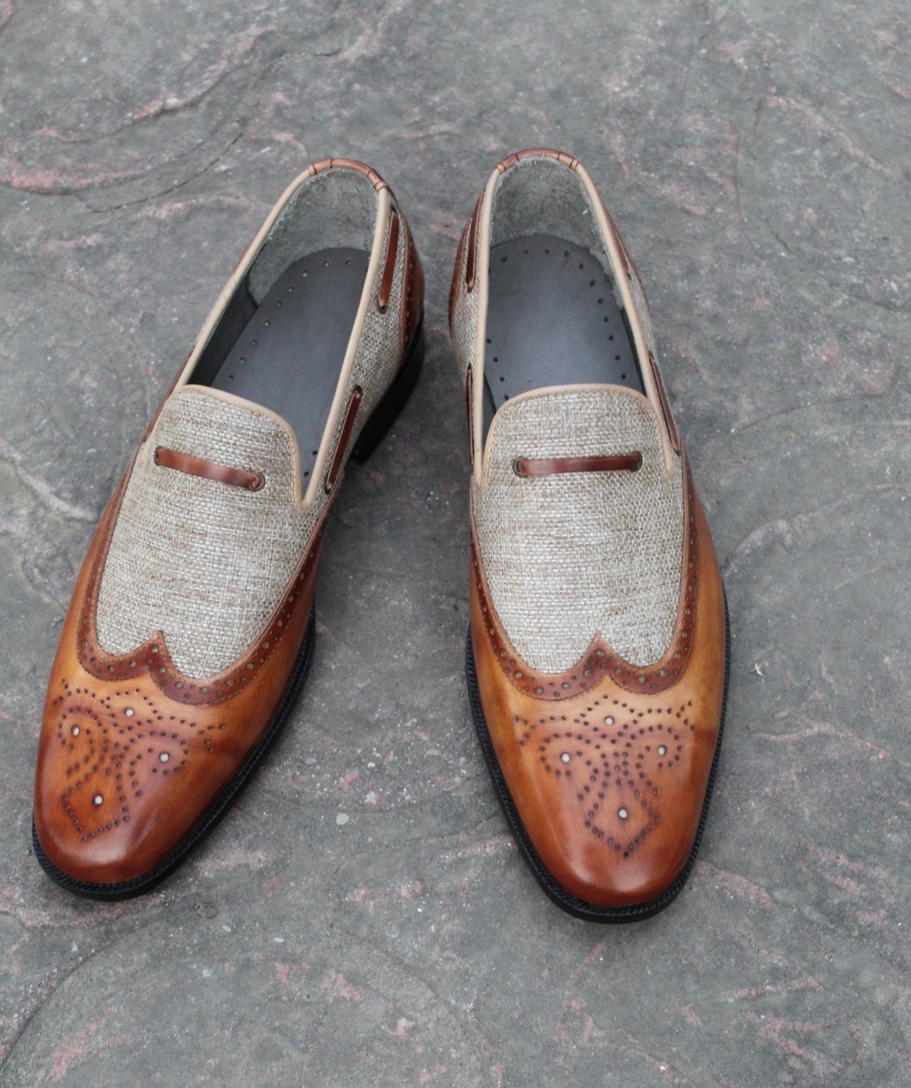 Crafted Leather Classic Men Brown / Tweed Leather Moccasin Loafers Wingtip Dress Shoes