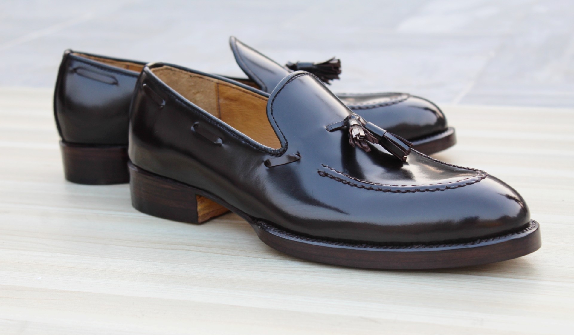 Inner: Soft Leather Sole: Leather Gender : Male Heel: Leather Color: Dark Brown Style: Tassel Loafers Shoes Lining Soft Calf Leather Lining Totally Hand stitched Manufacturing time 7-10 business days If you can’t find your Size/Colorjust send us message we will make for you.