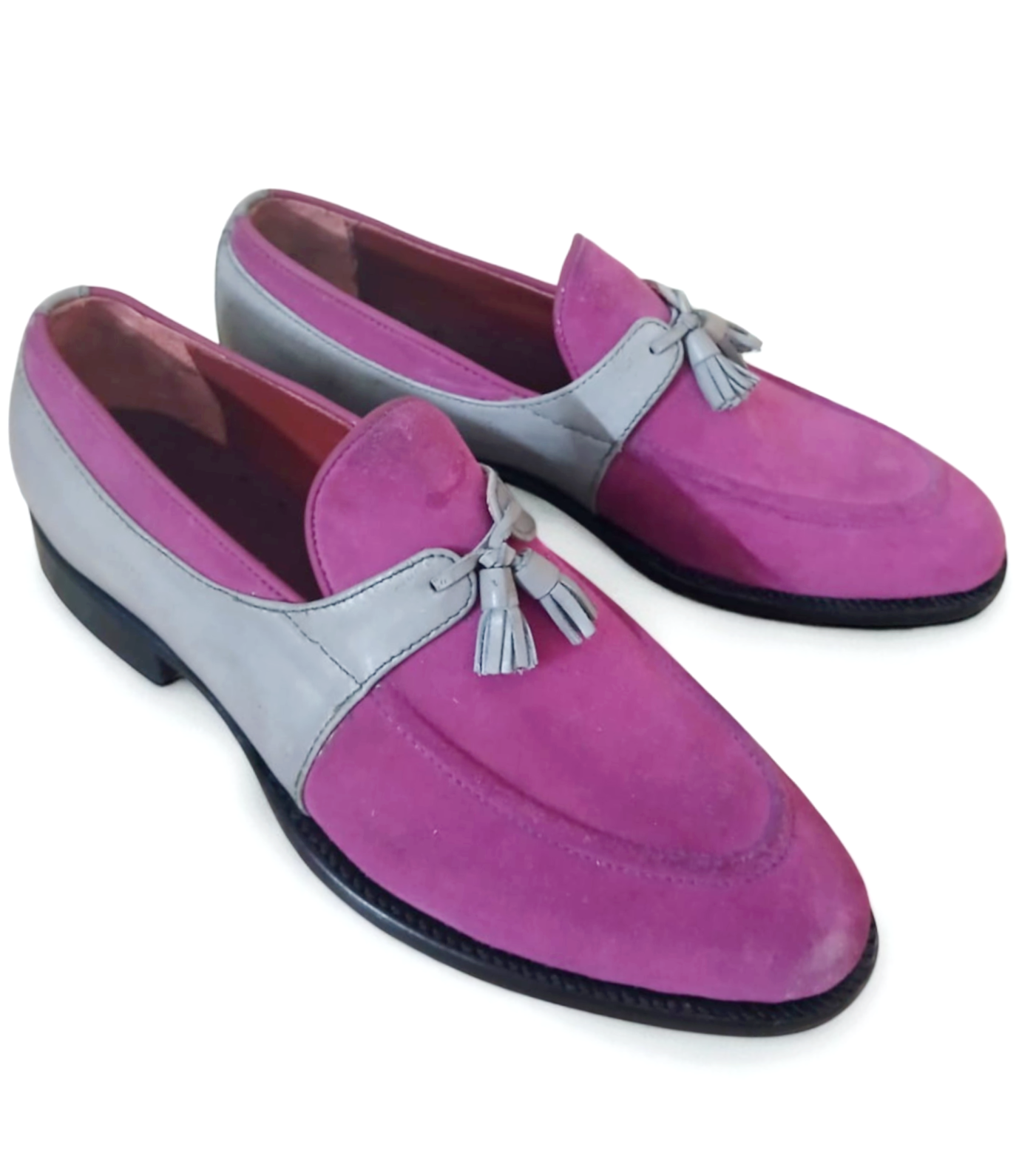 Crafted Leather Classic Pink Suede Gray Leather Tassel Loafers Dress Shoes