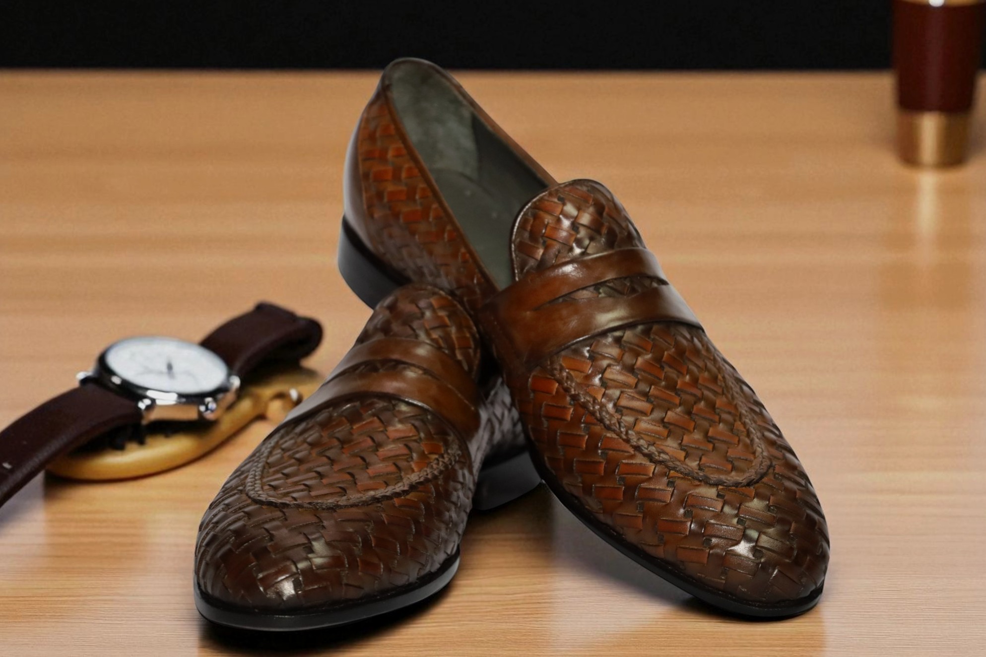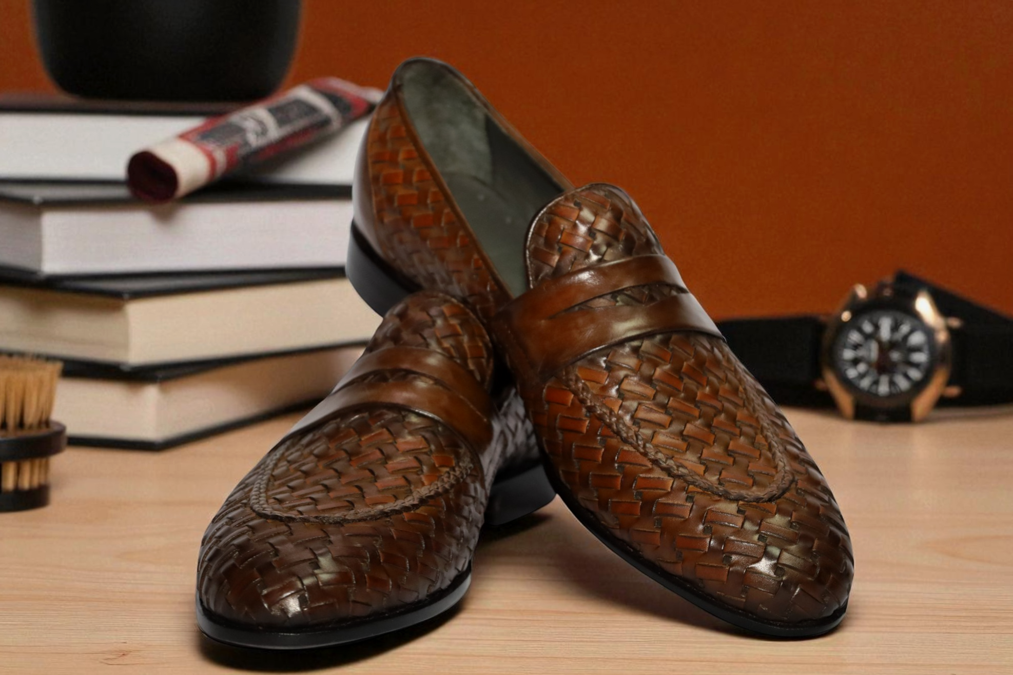 Crafted Leather Handmade Men Brown Woven Leather Loafers Dress Shoes