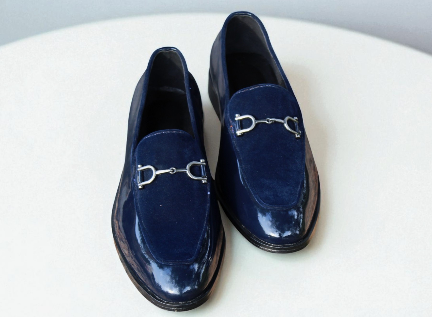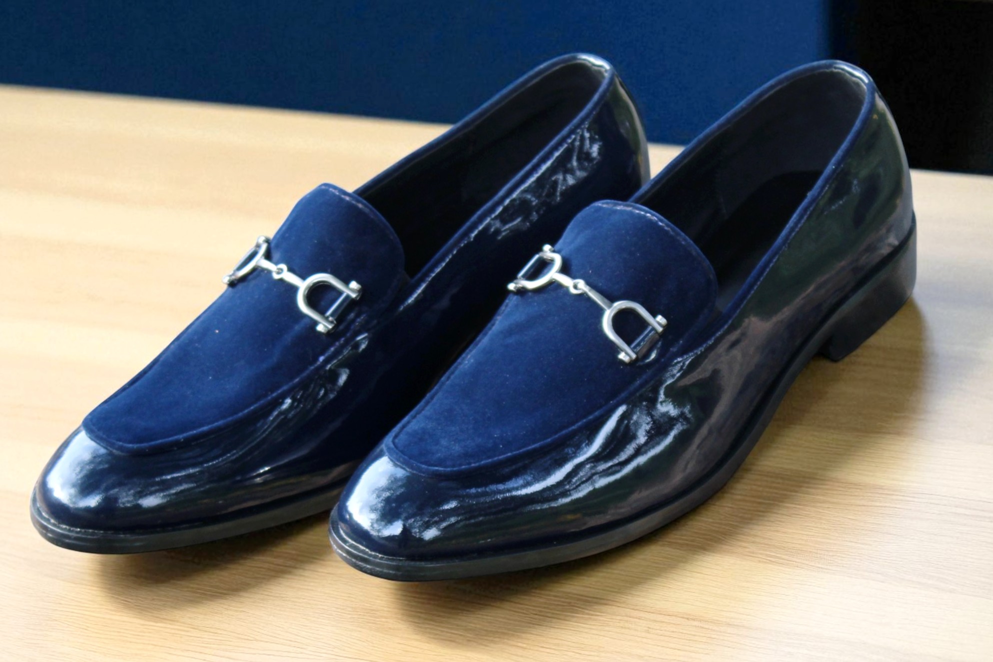 Crafted Leather Blue Velvet / Patent Classic Moccasin Loafers Dress Shoes