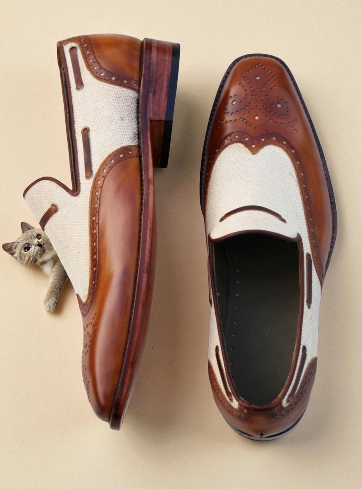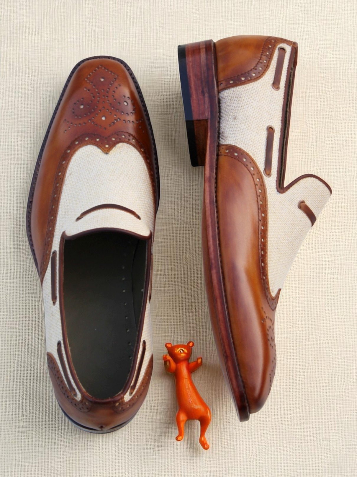 Crafted Leather Classic Men Brown Patina / Tweed Contrast Wingtip Loafers Dress Shoes