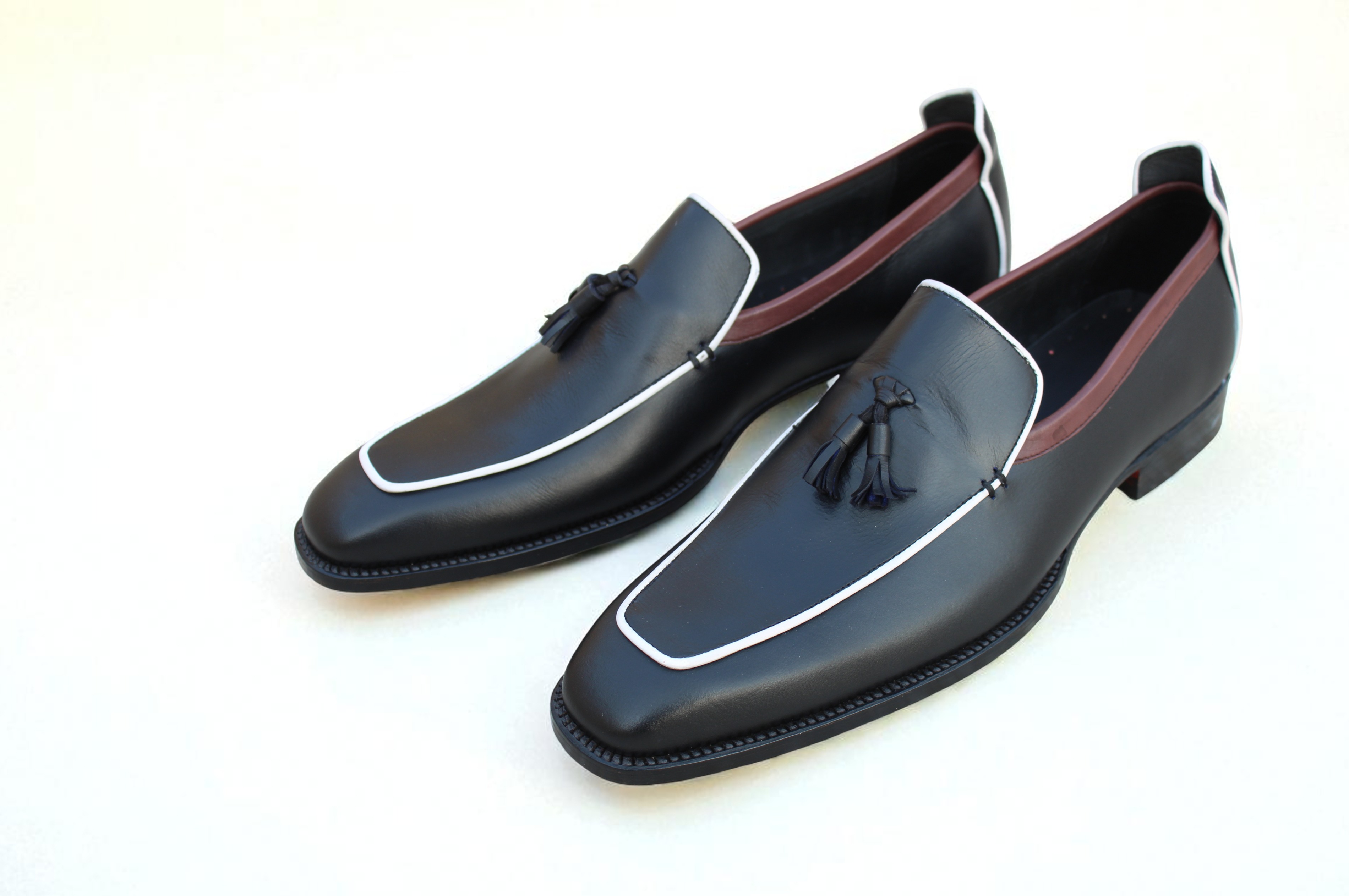 Crafted Leather Classic Handmade Black with White Lining Tassel Loafers Shoes