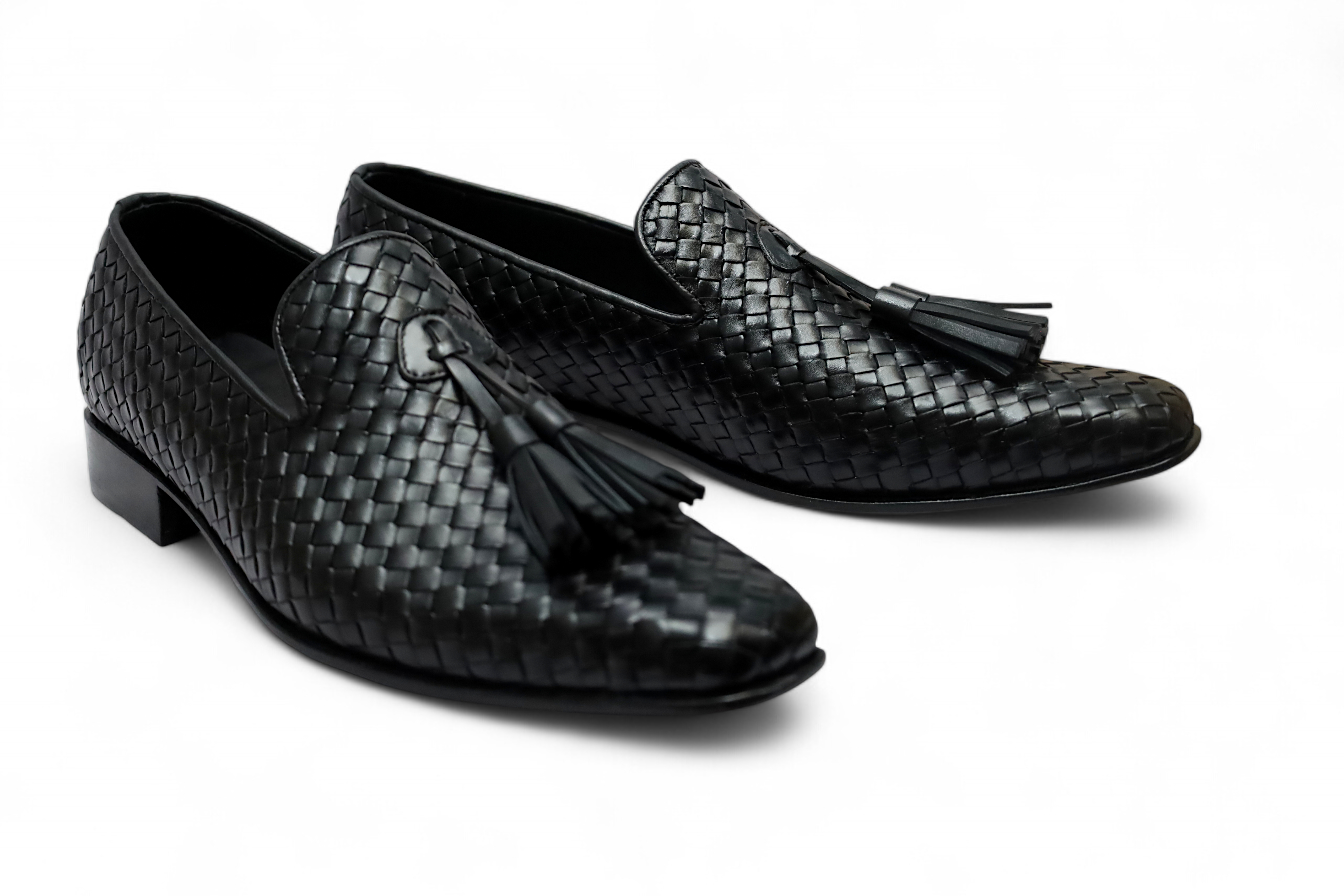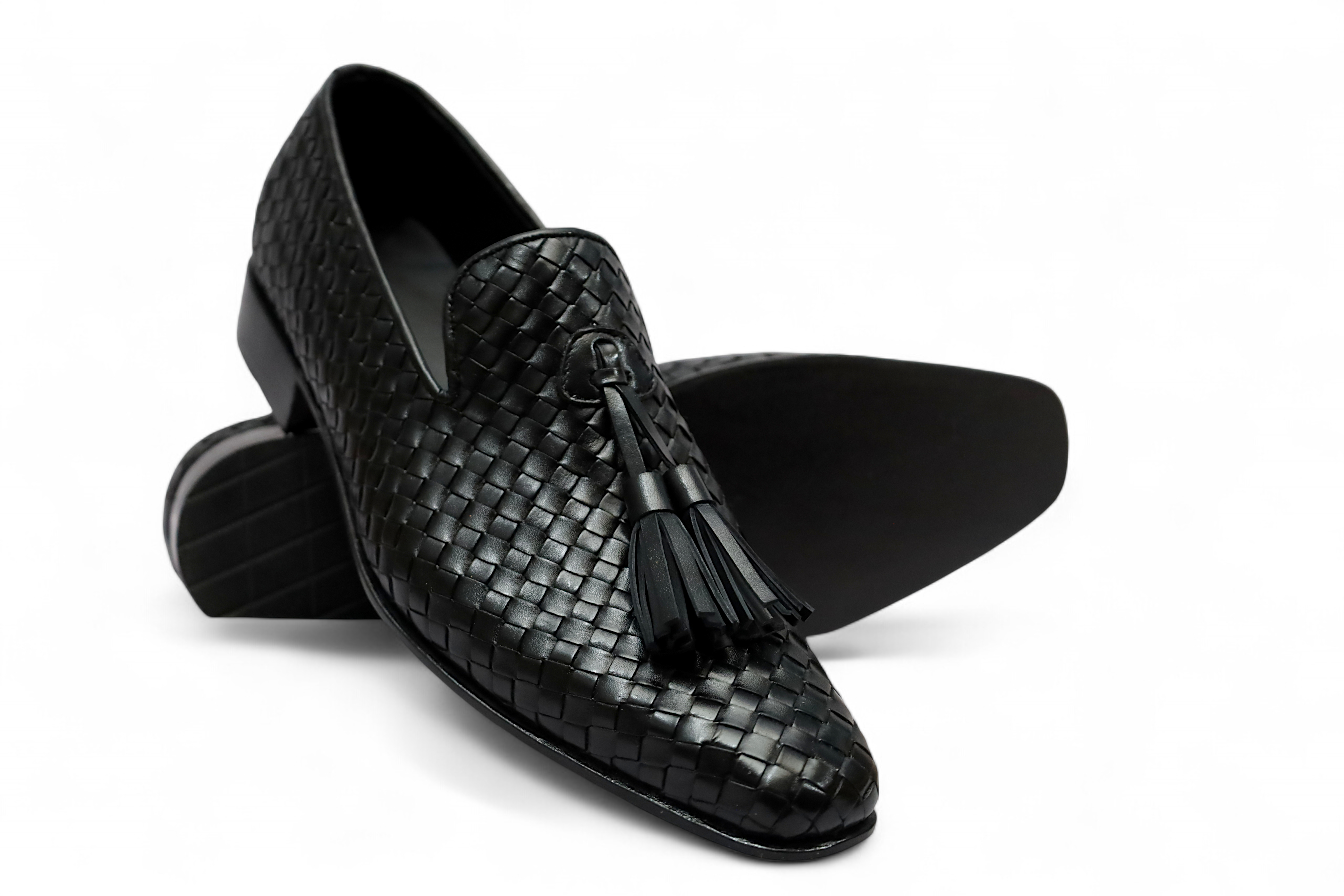 Crafted Leather Men Elegant Classic Black Woven Leather Tassel Loafers Dress Shoes
