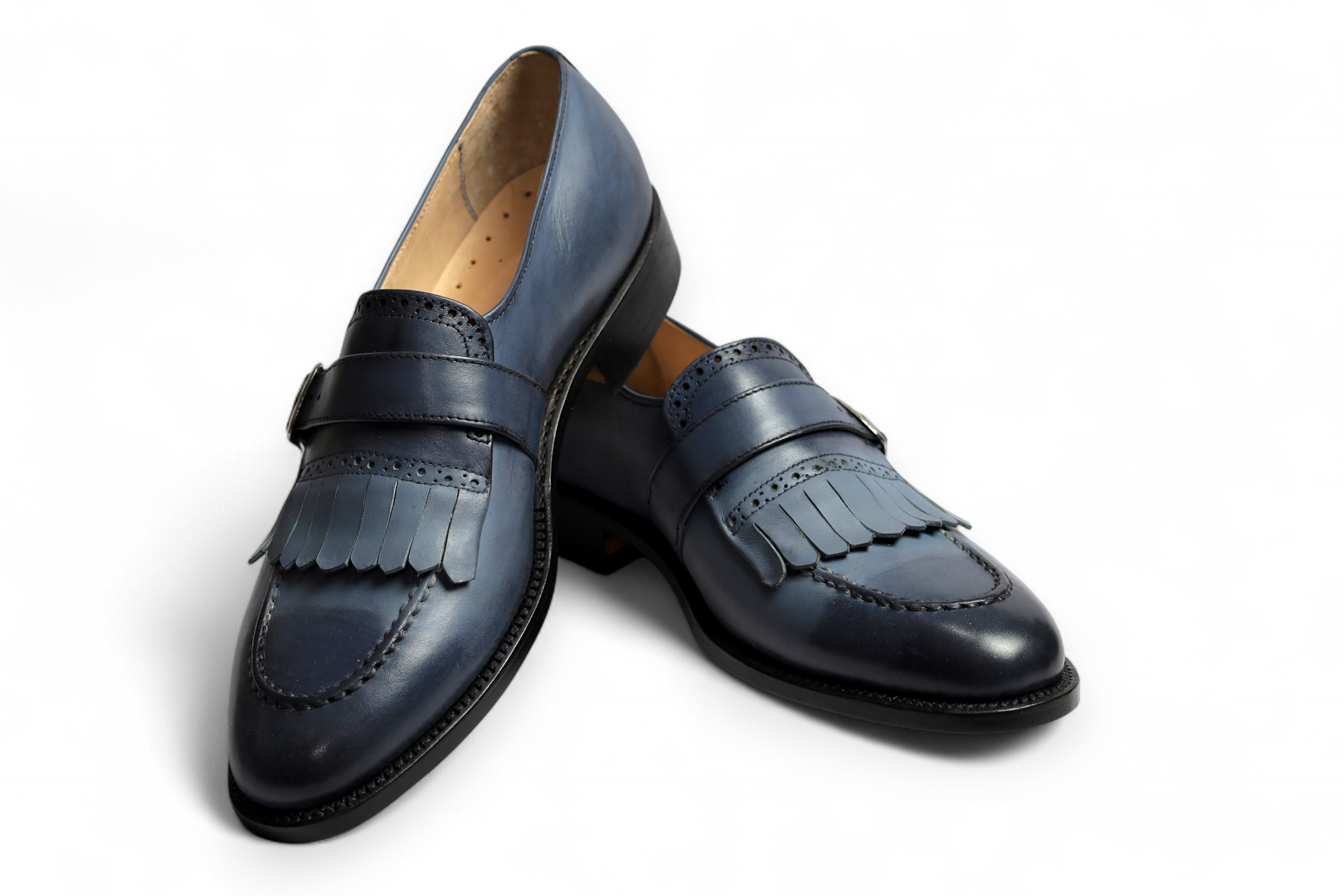 Crafted Leather Handmade Gray Black Shaded Fringes Single Monk Strap Party Wear Dress Shoes
