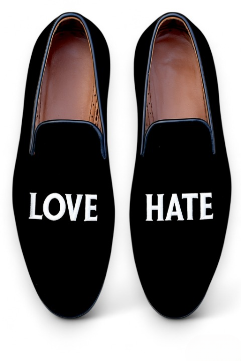 Crafted Leather Classic Black Velvet Shoes Embroidery LOVE HATE Loafers