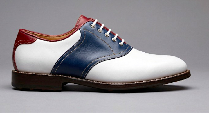 Crafted Leather Mens Tri Color White/Blue/Red Leather Saddle Golf Dress Shoes