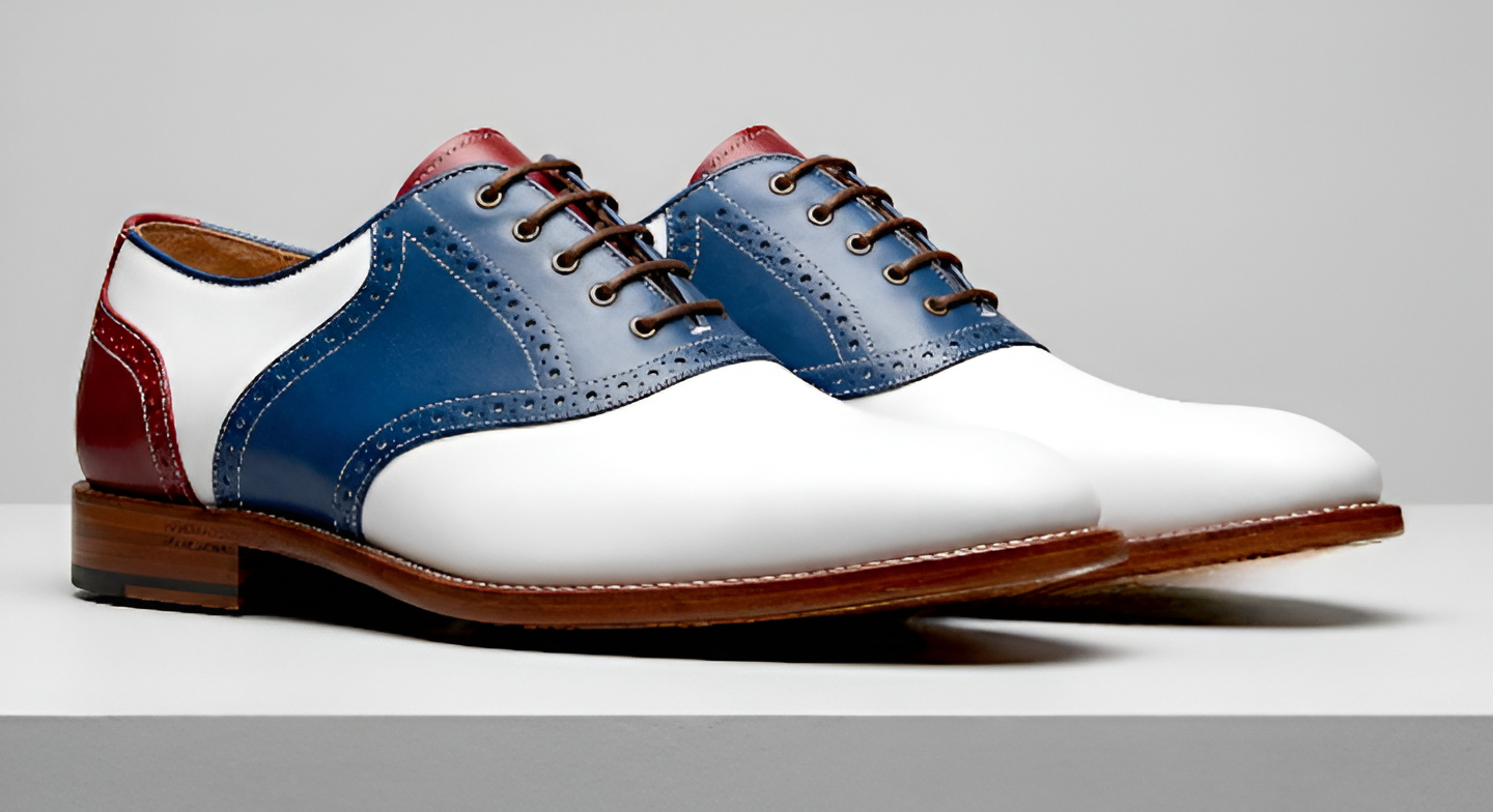Crafted Leather Mens Tri Color White/Blue/Red Leather Saddle Golf Dress Shoes