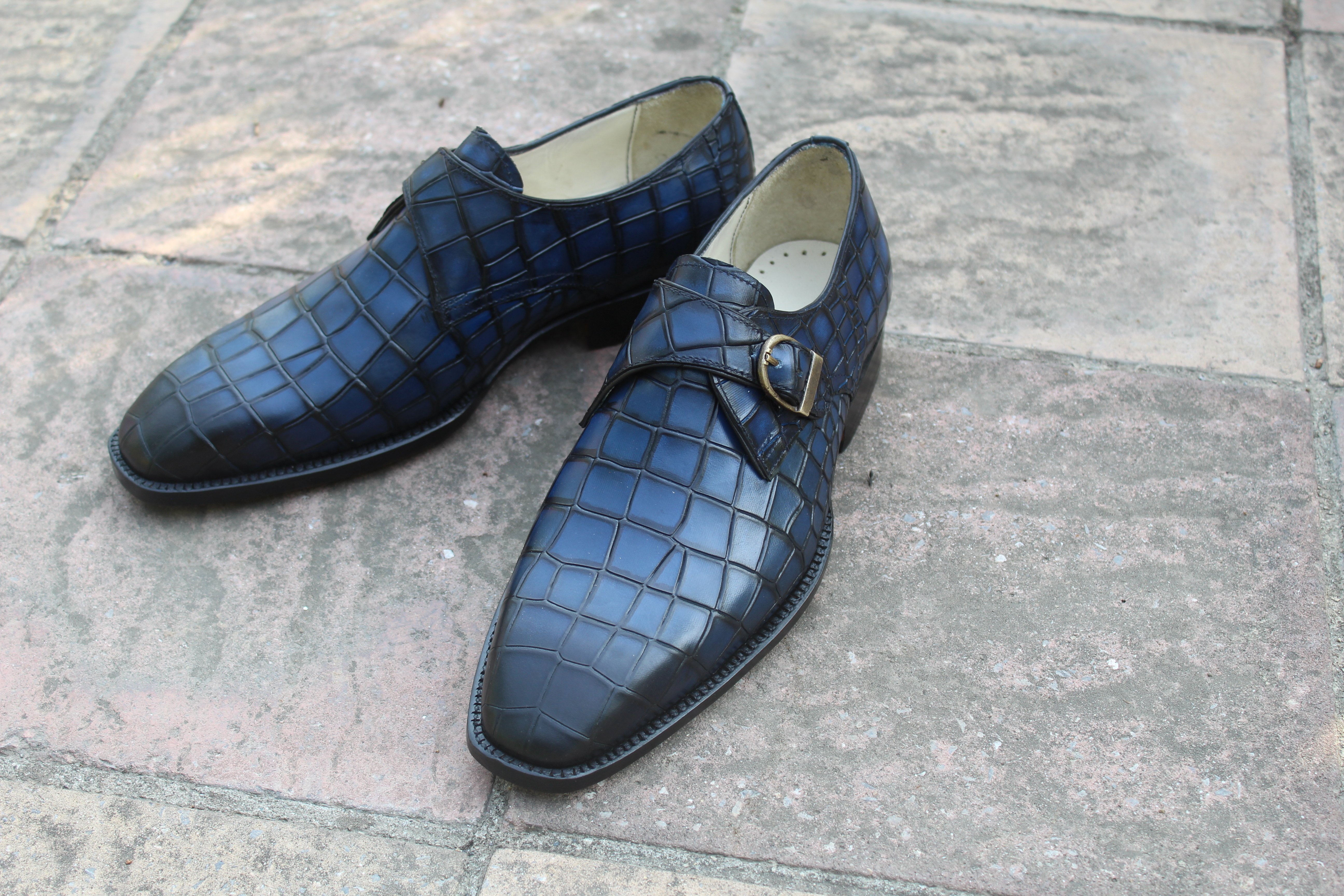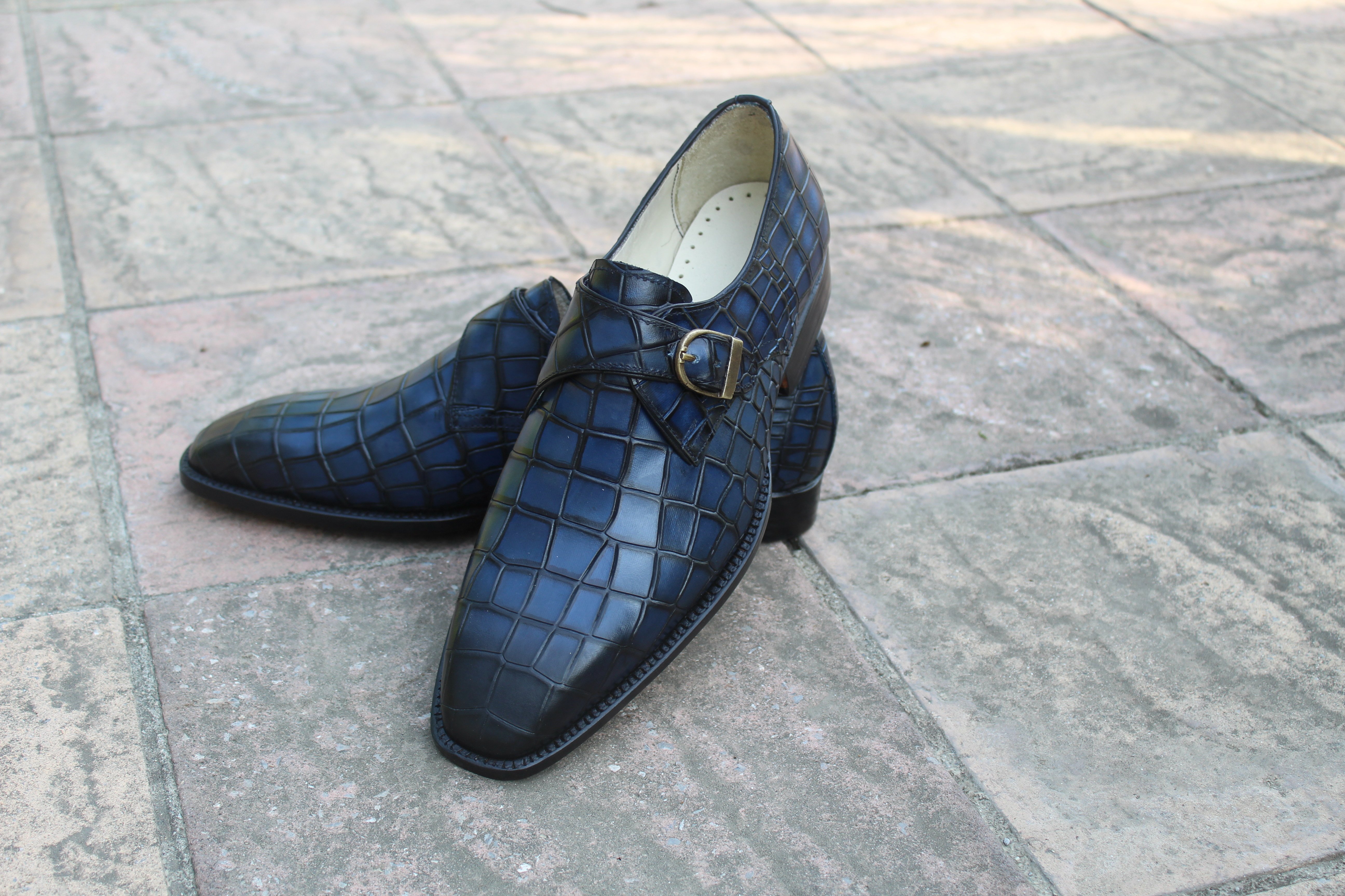 Crafted Leather Handmade Men Blue Crocodile Texture Leather Monk Strap Shoes