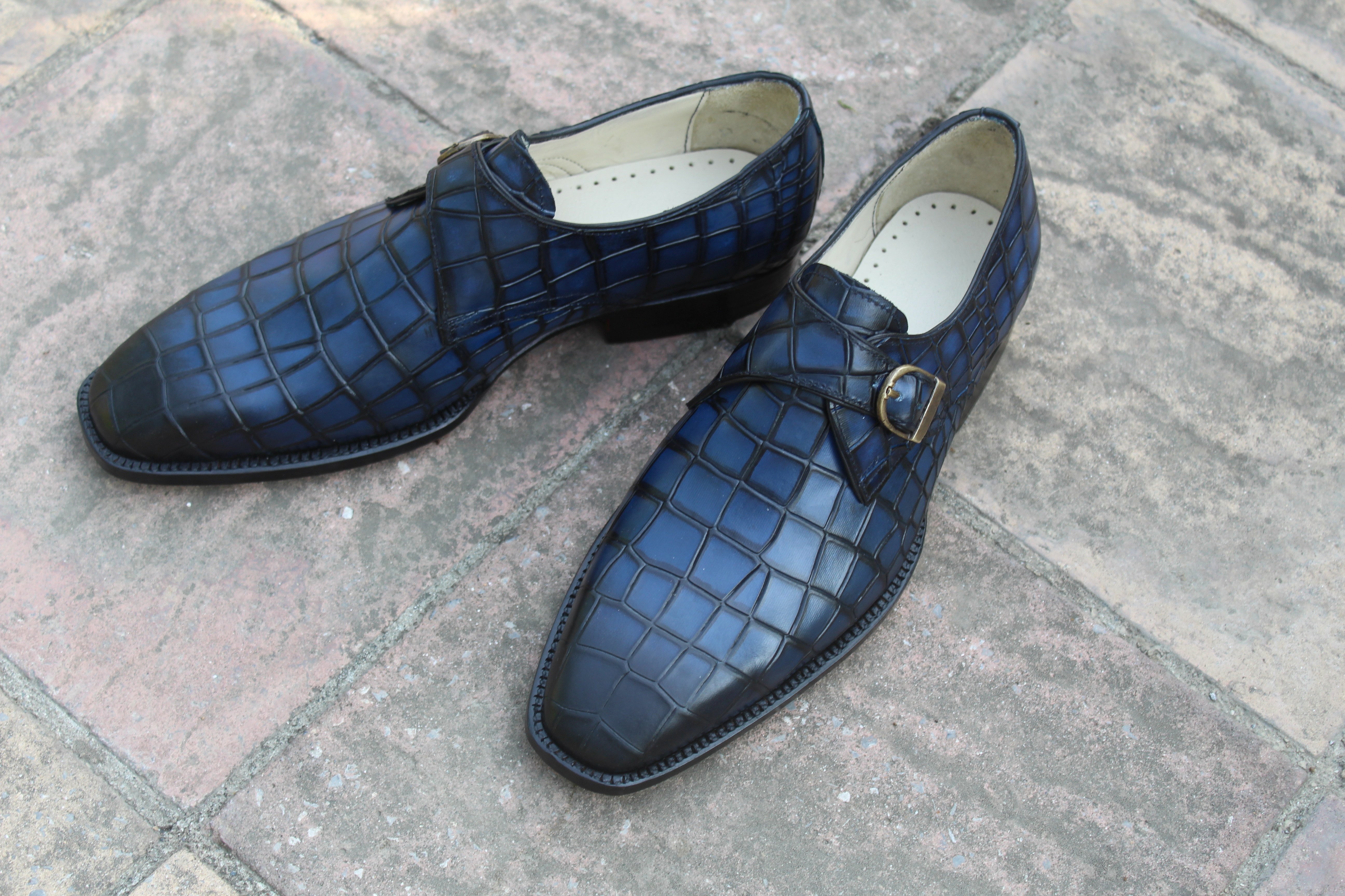Inner: Soft Leather Sole: Leather Gender : Male Heel: Leather Color: Blue Style: Monk Strap Shoes Totally Hand stitched Manufacturing time 7-10 business days If you can’t find your Size/Colorjust send us message we will make for you.
