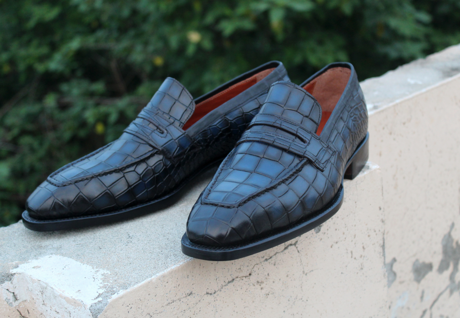 Crafted Leather Handmade Blue Crocodile Loafer Slip On Stylish Dress Shoes