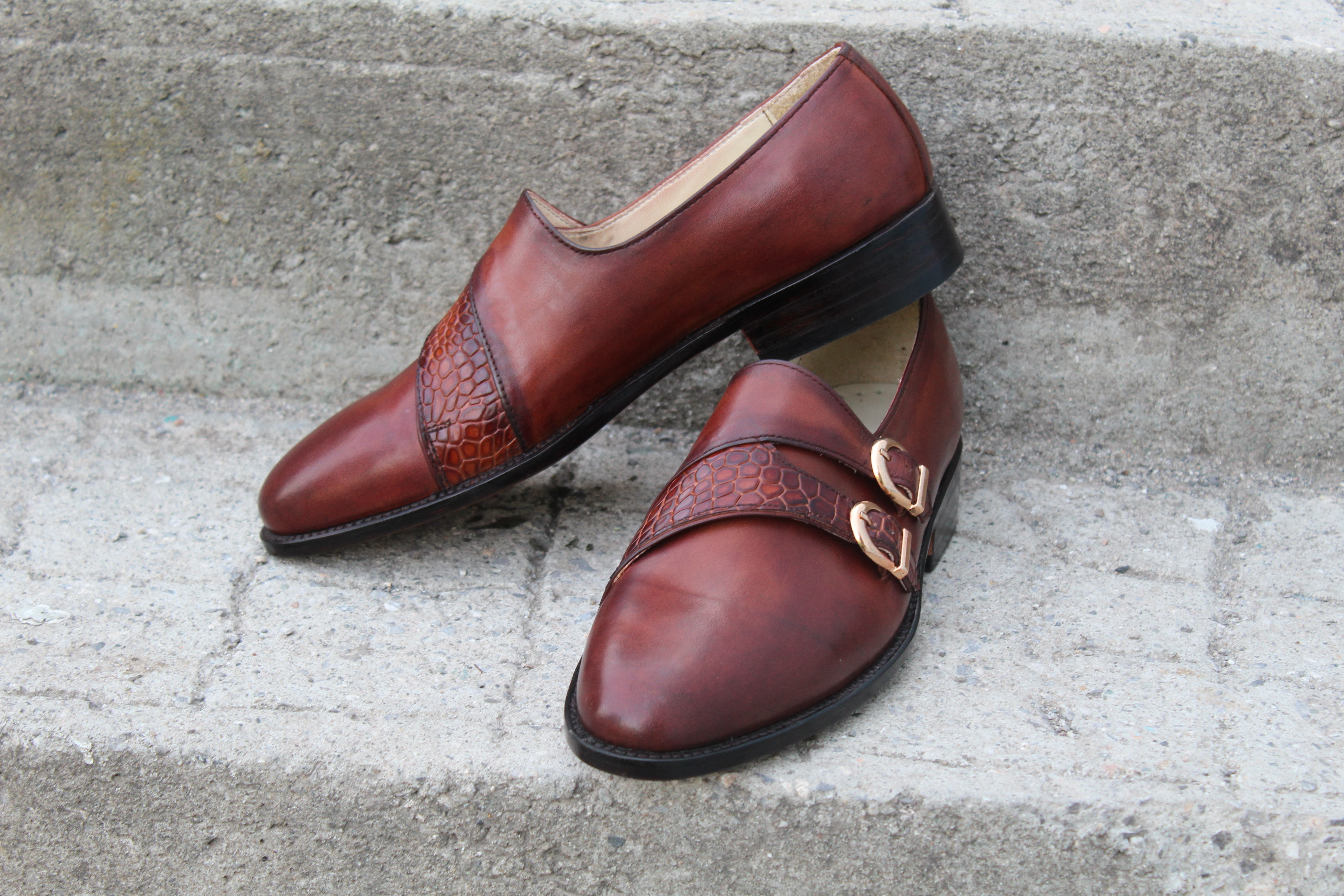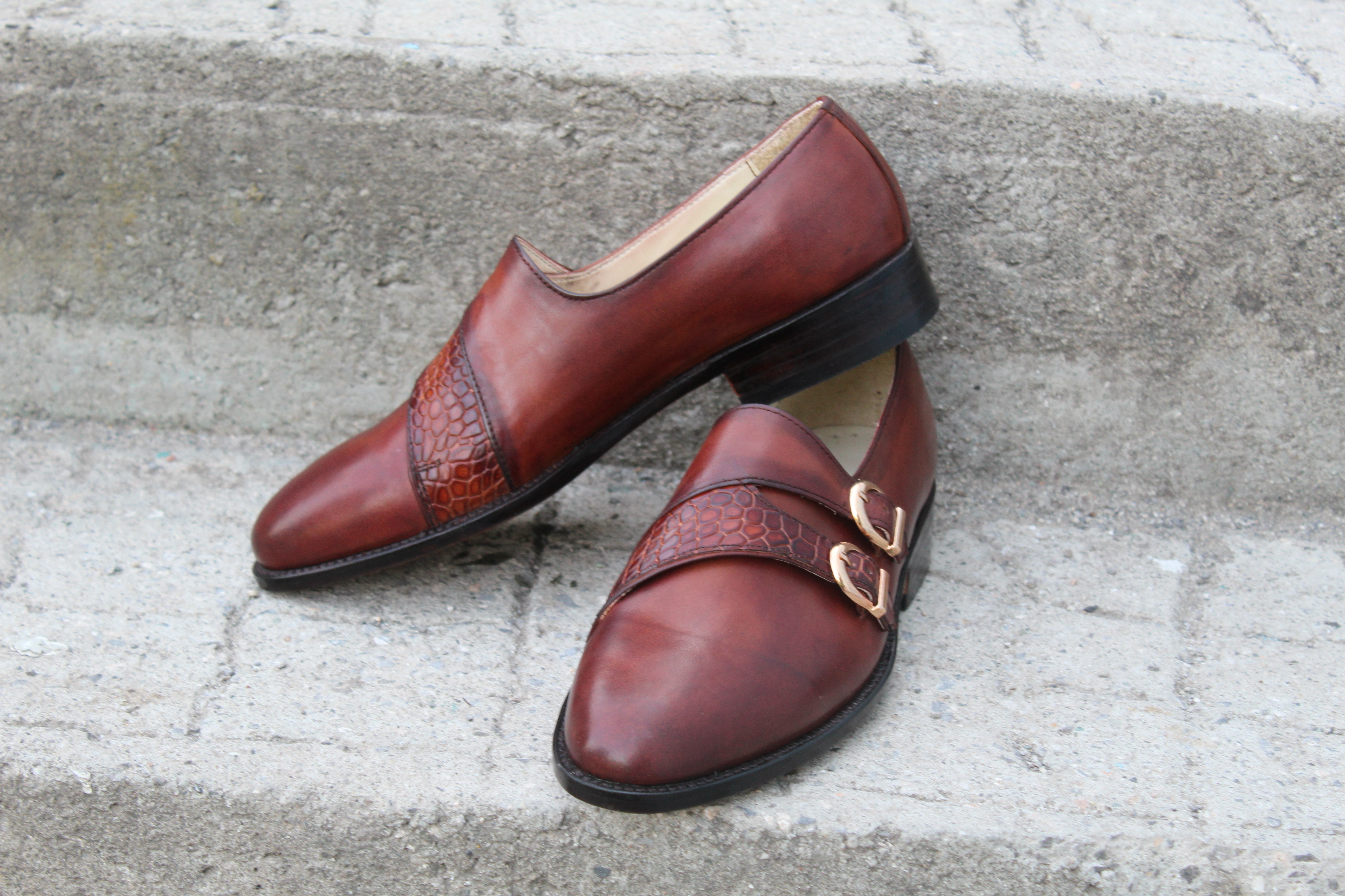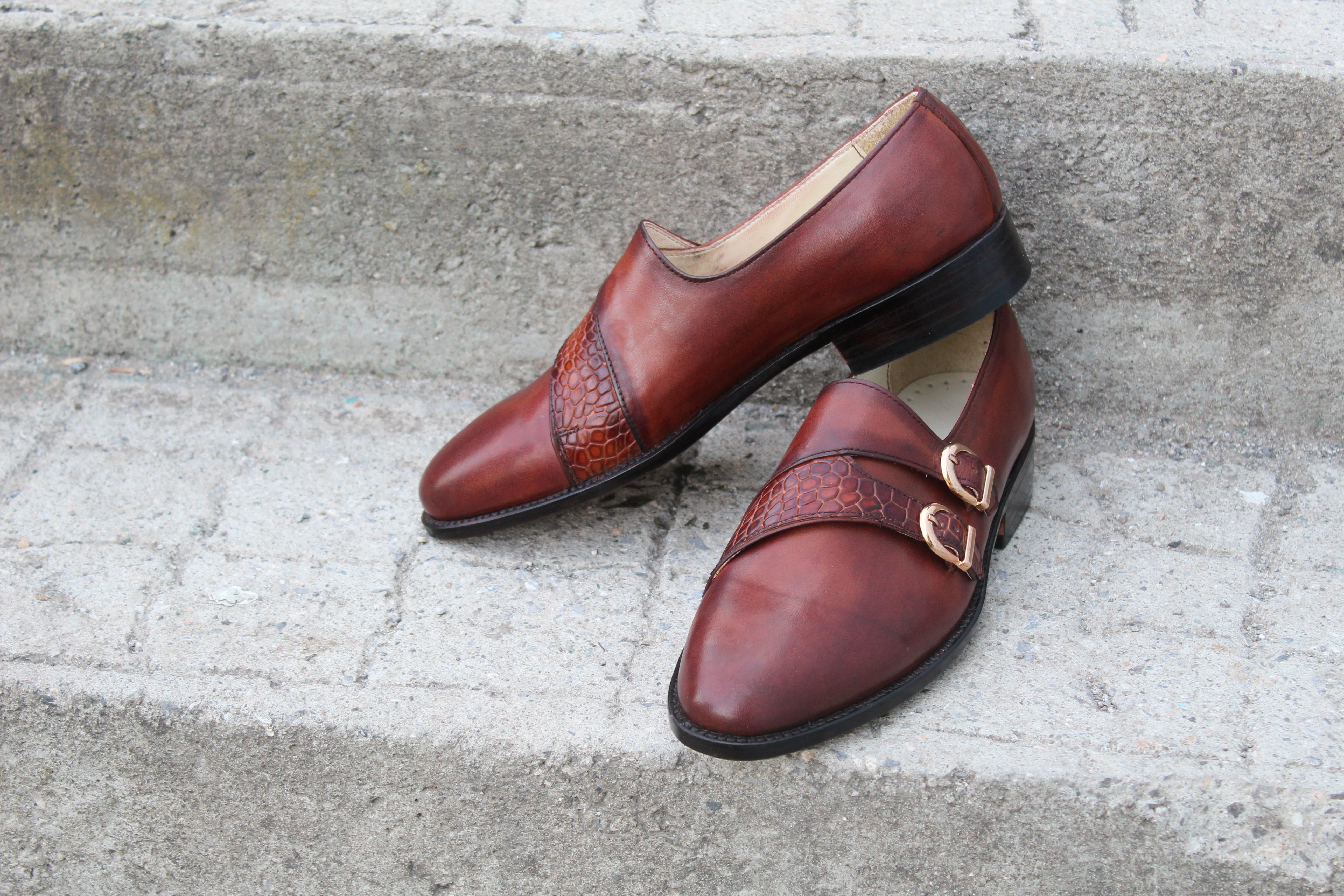 Crafted Leather Unique Men Classic Brown Patina Leather Monk Single Crocodile Strap Party Wear Shoes