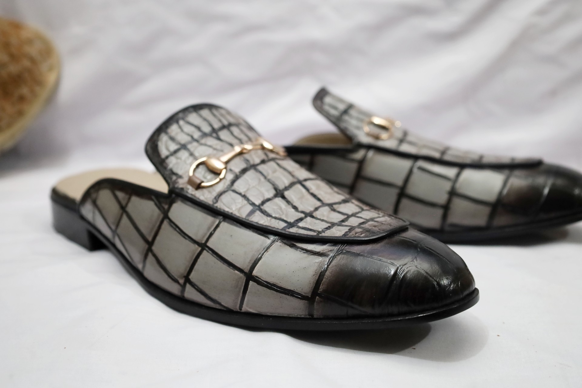 Crafted Leather Handmade Classic Gray Alligator Textured Leather Mules, Men Leather Dress Slippers Shoes