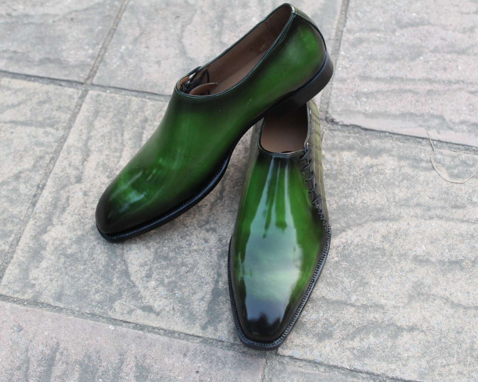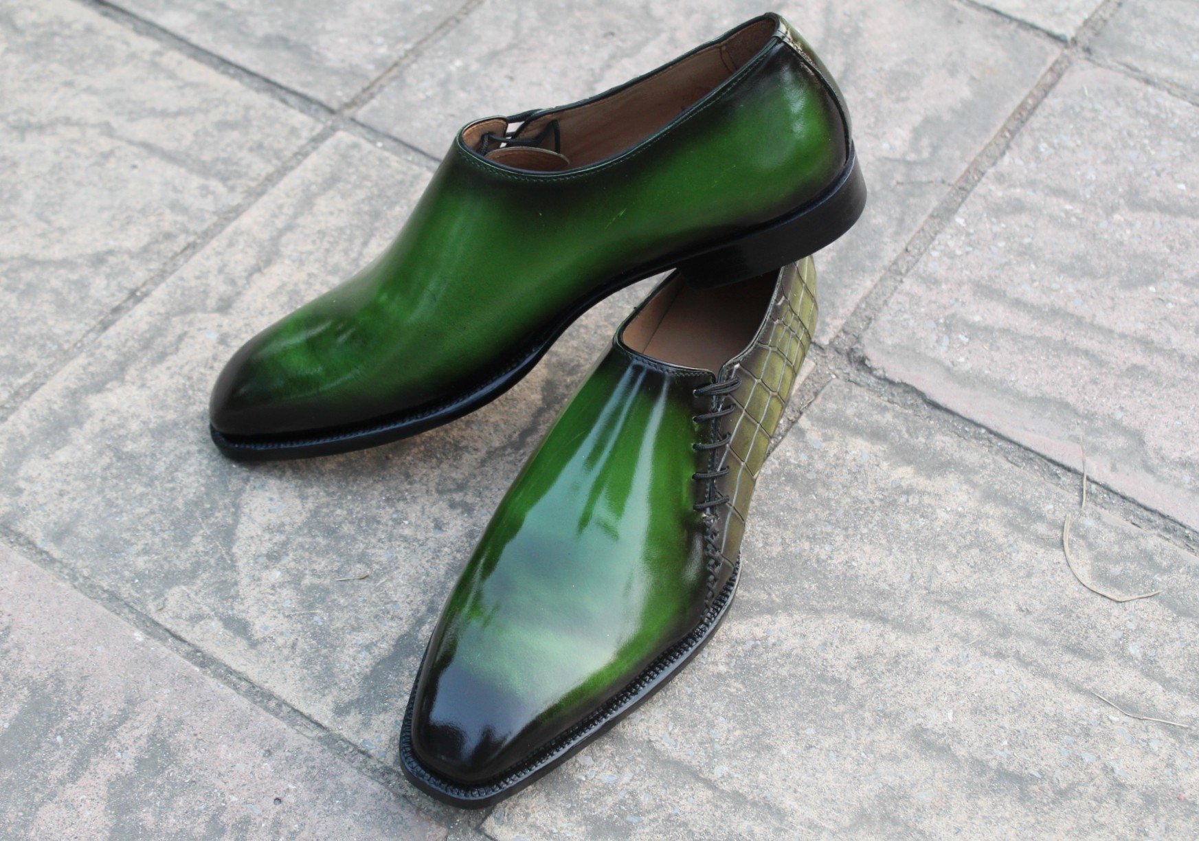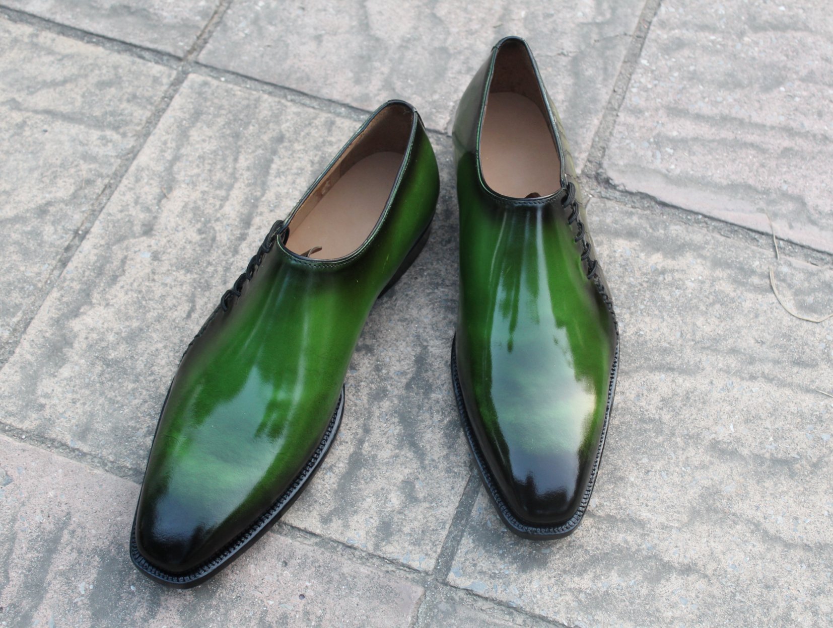 Inner: Soft Leather Sole: Leather Gender : Male Heel: Leather Color: Green Patina Style: Side Laces Dress Shoes Lining Soft Calf Leather Lining Totally Hand stitched Manufacturing time 7-10 business days If you can’t find your Size/Colorjust send us message we will make for you.