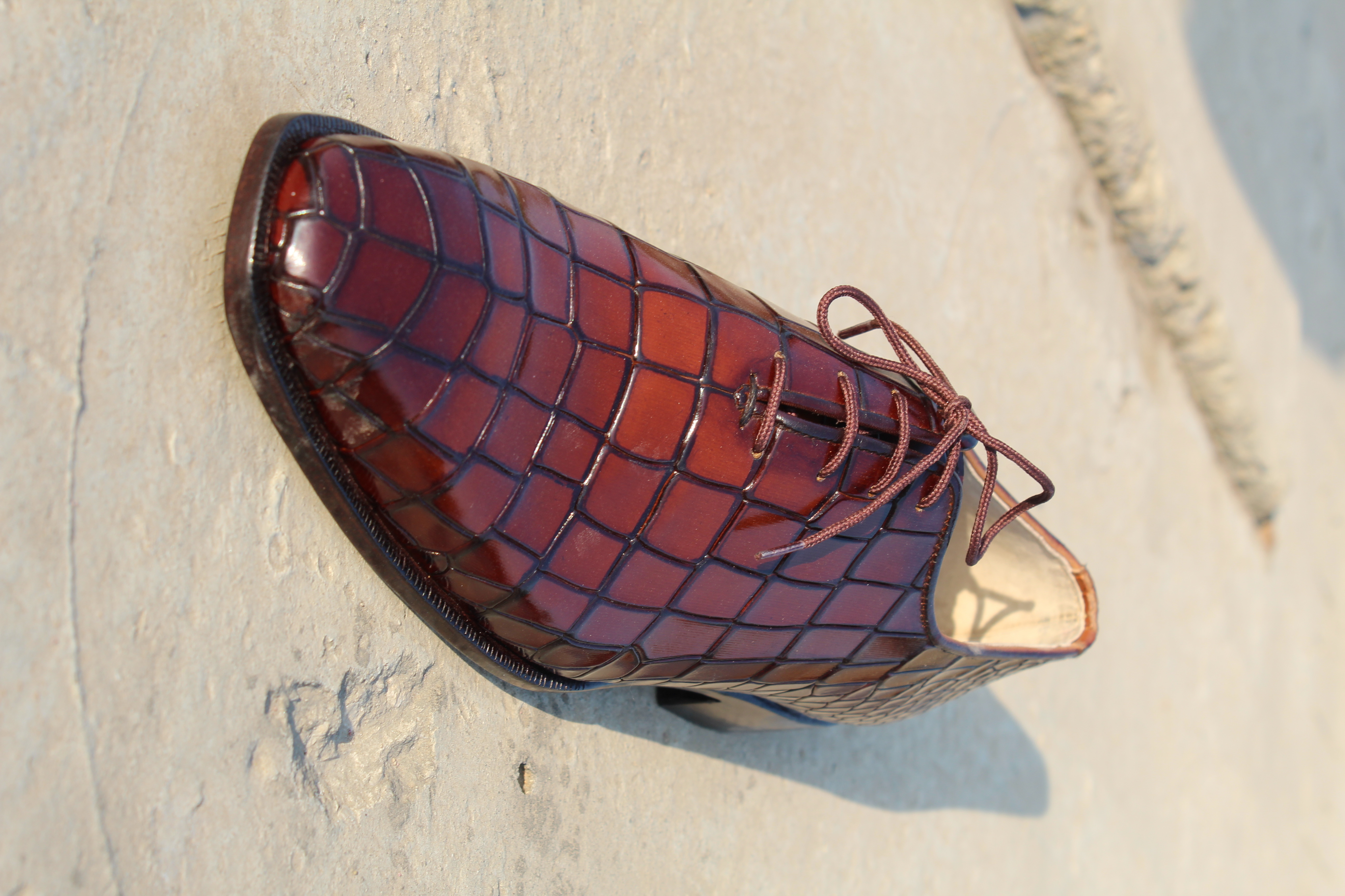 Handmade Brown Crocodile Texture Leather Lace up Dress Shoes