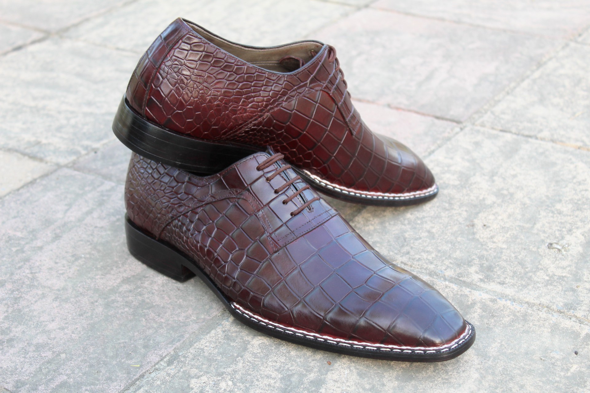 Crafted Leather Classic Dark Brown Crocodile Texture Leather Norwegian Welted Alligator Oxford Dress Shoes