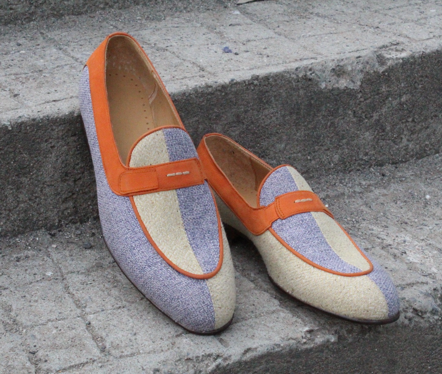 Crafted Leather Bespoke Custom Men Moccasin Dress Shoes Blue Beige Linen Fabric Belgian Loafers