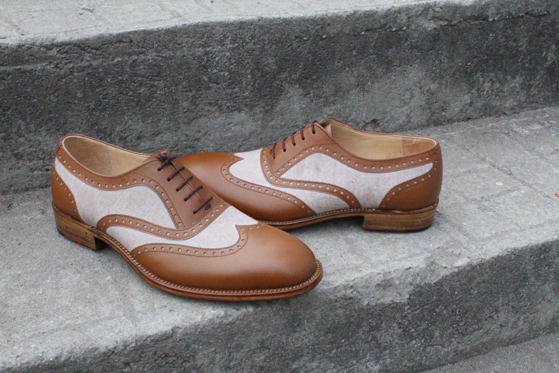 Crafted Leather Brown Leather and Tweed Contrast Wingtip Oxford Dress Shoes